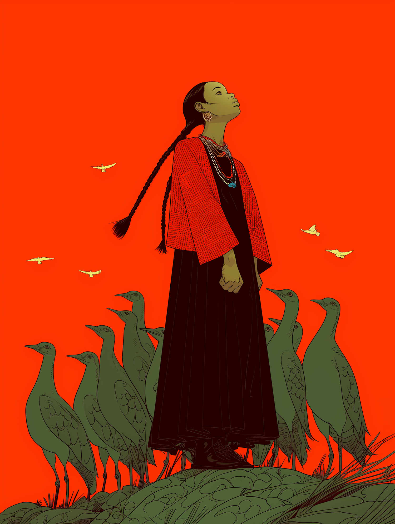 Illustration of a serene woman with braided hair among green birds on a vivid orange background, wearing a red jacket and black dress.
