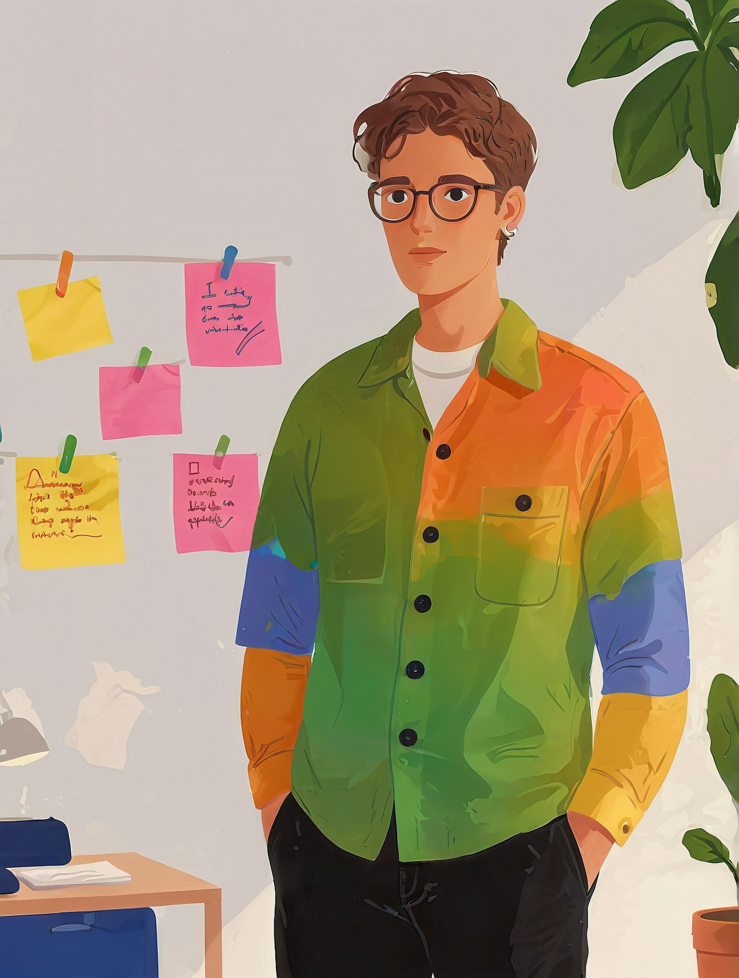 Young man in colorful shirt with glasses, standing by a wall with sticky notes and a plant, exuding creativity and focus.