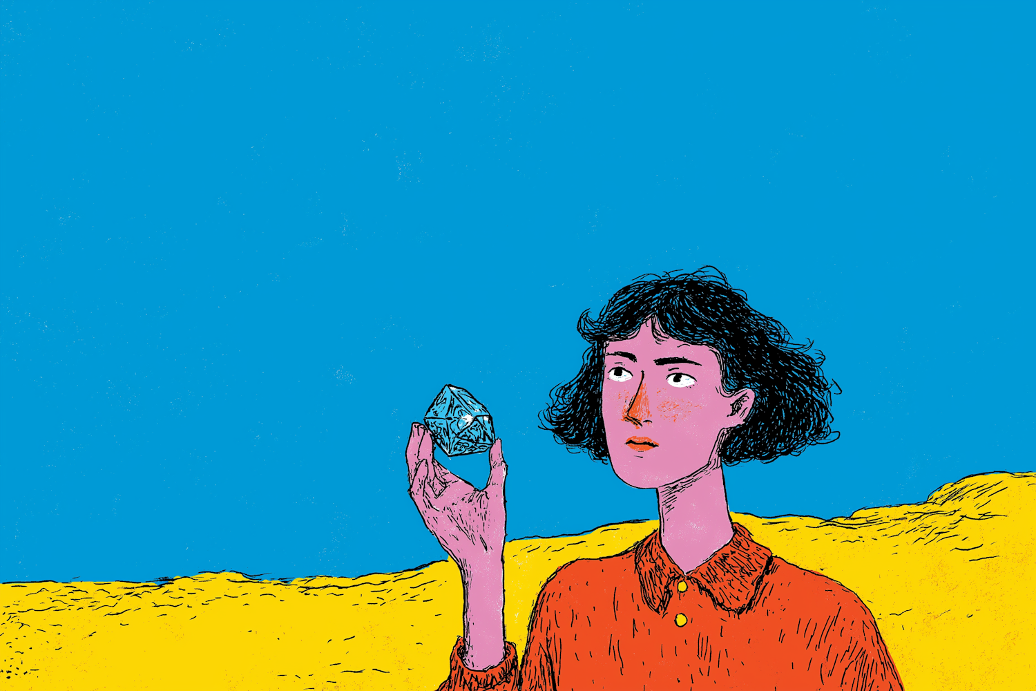 A vibrant illustration of a person holding a blue crystal against a bright blue sky and yellow ground, evoking a surreal and thoughtful mood.