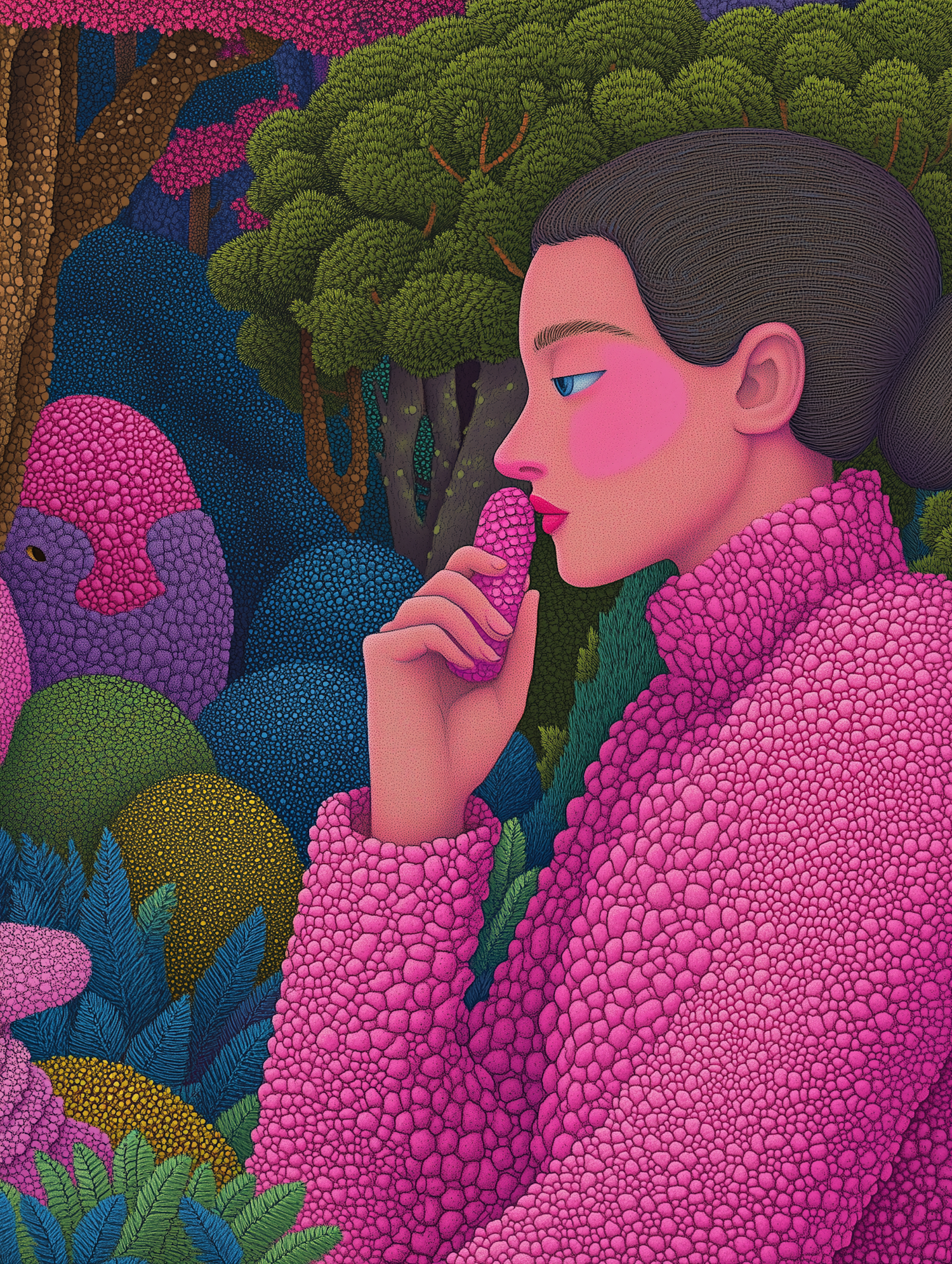 A woman in a textured pink coat in a vibrant, surreal forest setting, holding a pink object to her lips. Intricate and colorful illustration.