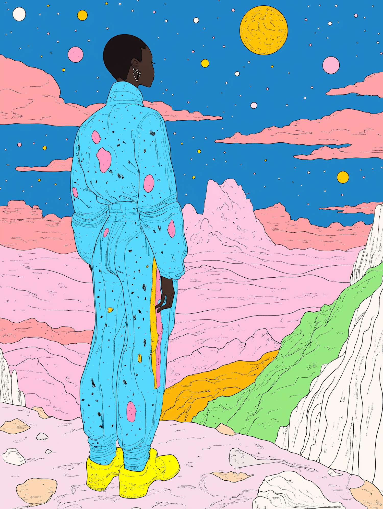 Surreal illustration of a person in a blue outfit with pink patches, standing in a colorful, dreamlike landscape under a starry sky.