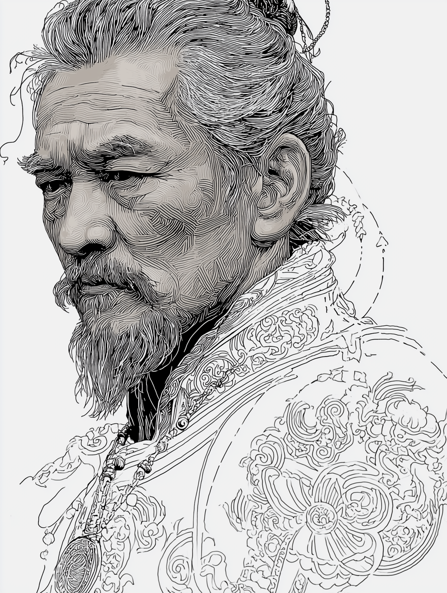 Intricate line art of a man with traditional attire and detailed patterns, showcasing cultural and artistic depth.