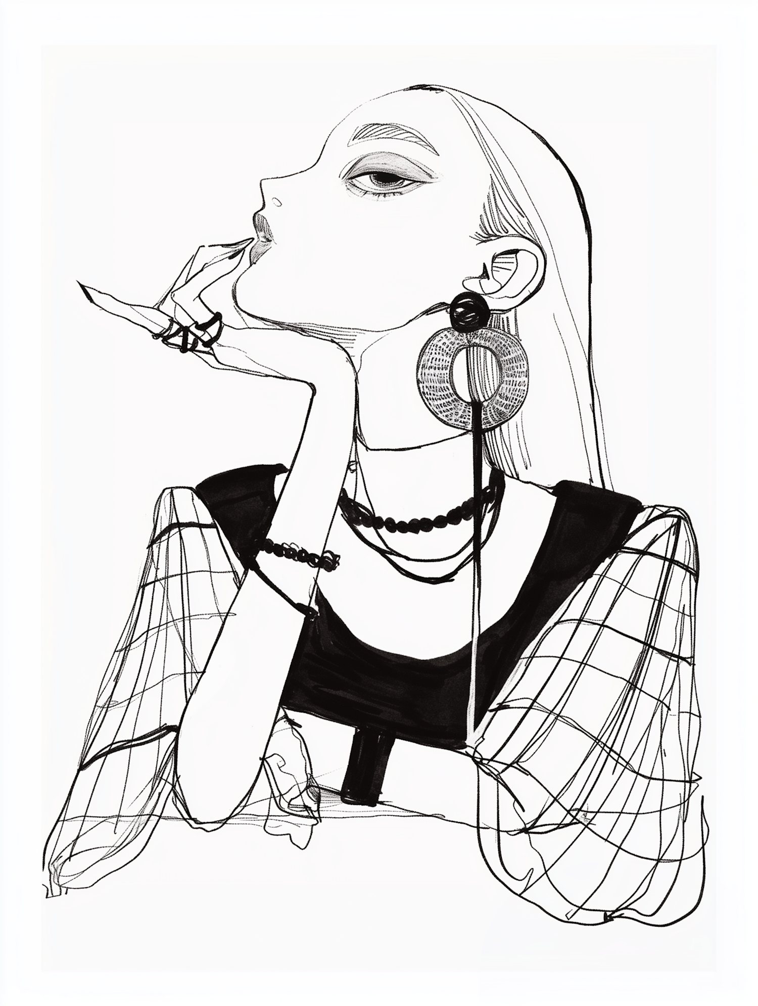 Stylized black and white illustration of a fashionable woman with bold features, oversized earrings, and chic accessories.