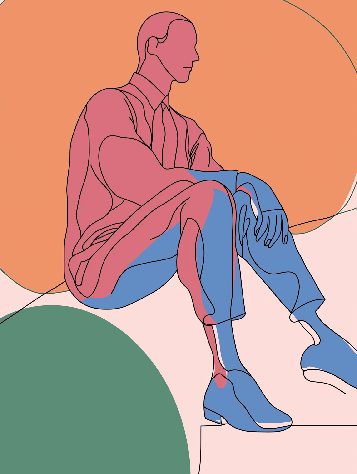Stylized illustration of a person sitting with abstract shapes in vibrant colors, featuring pink and blue layers.