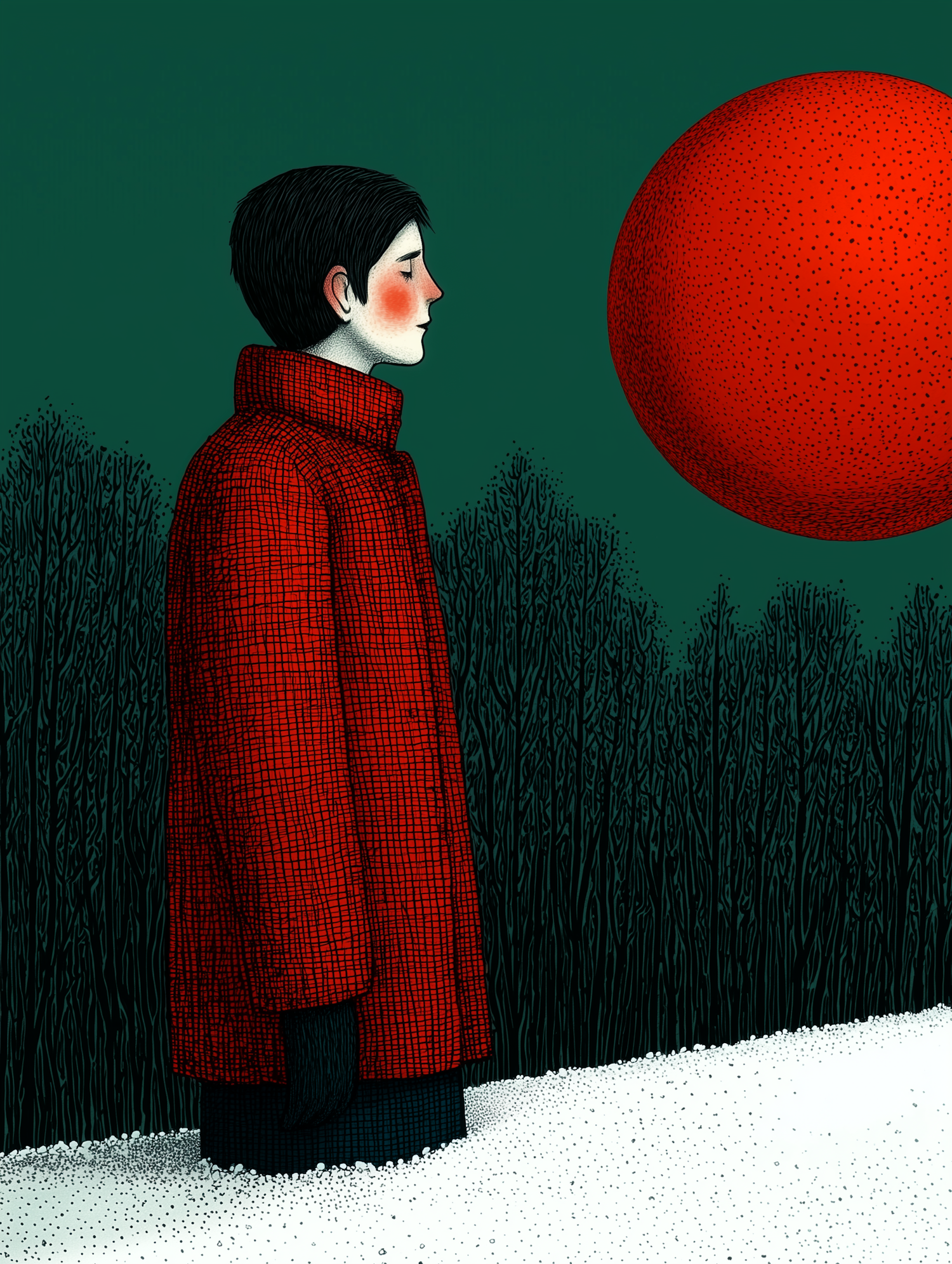 Stylized illustration of a person in a red coat gazing at a red sphere, set against a green forest background with snow.
