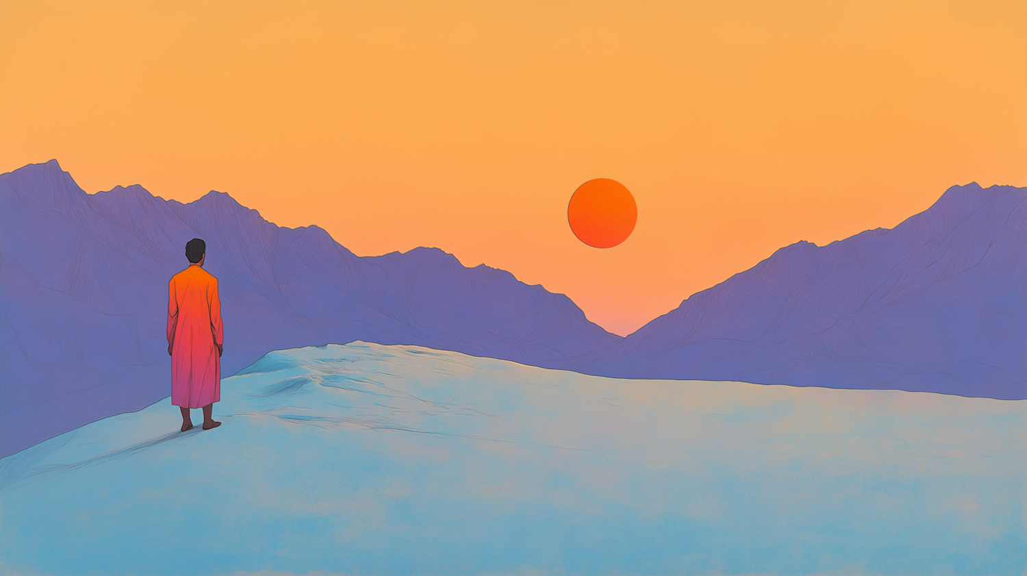 A lone figure in a red robe stands on snowy terrain, gazing at a vibrant sunset over purple mountains. Tranquil and contemplative scene.