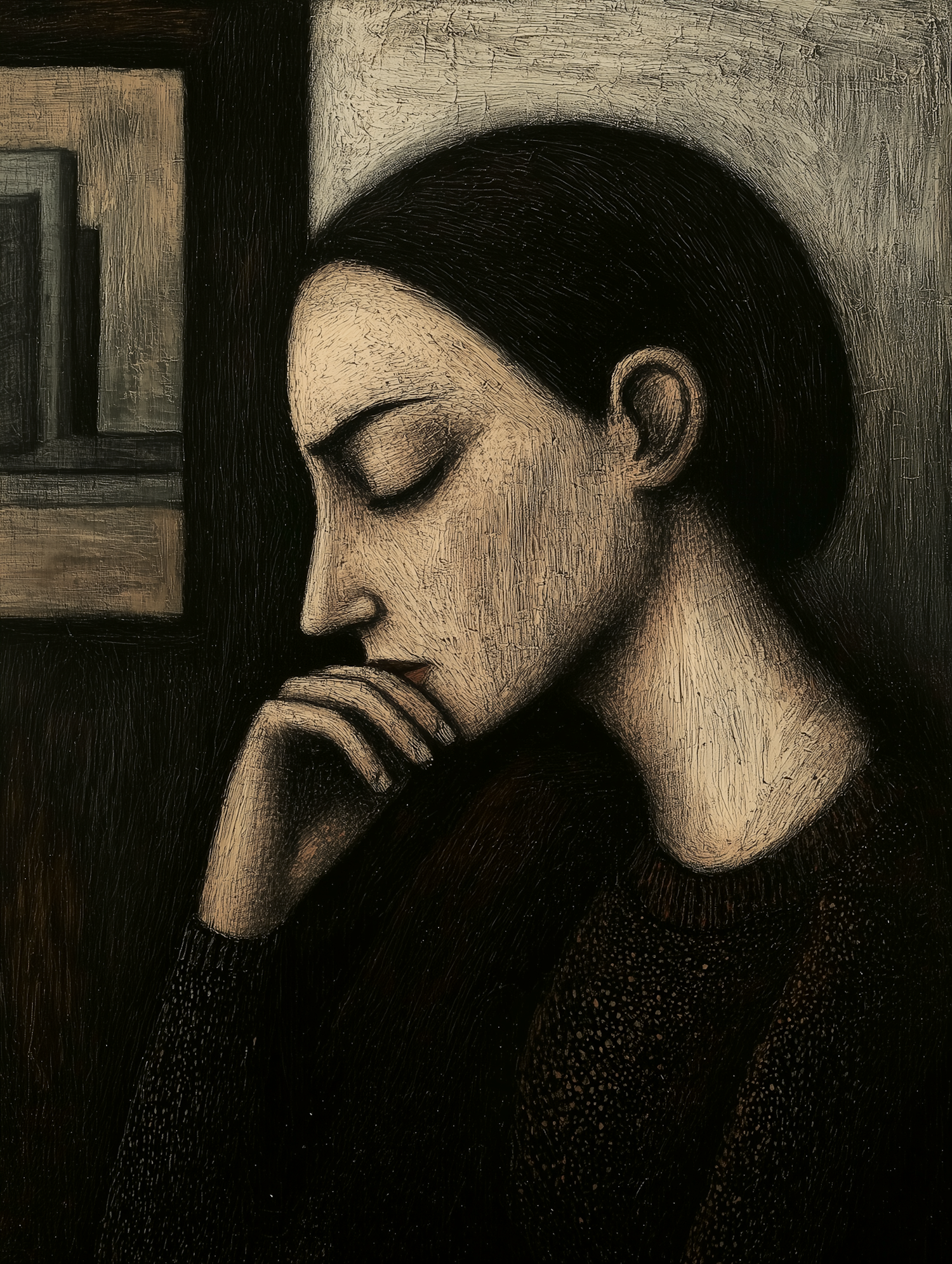 Textured painting of a woman in profile, deep in thought, with muted tones and visible brushstrokes creating a reflective atmosphere.