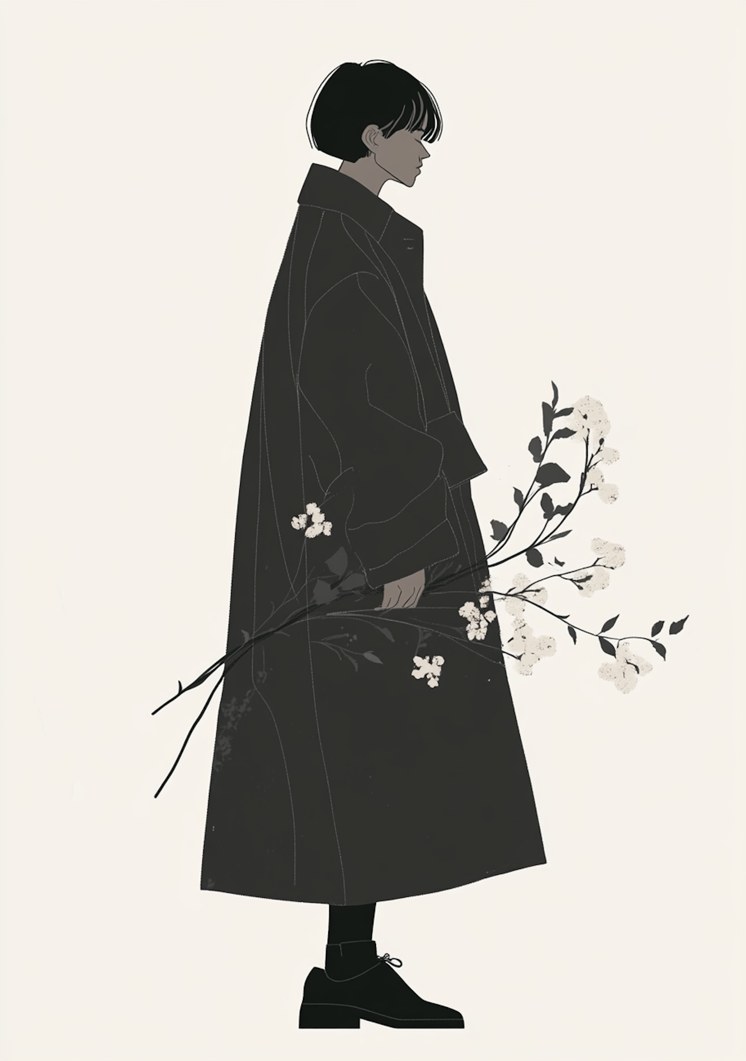 Minimalist illustration of a person in a dark coat holding a branch with white flowers against a light beige background.