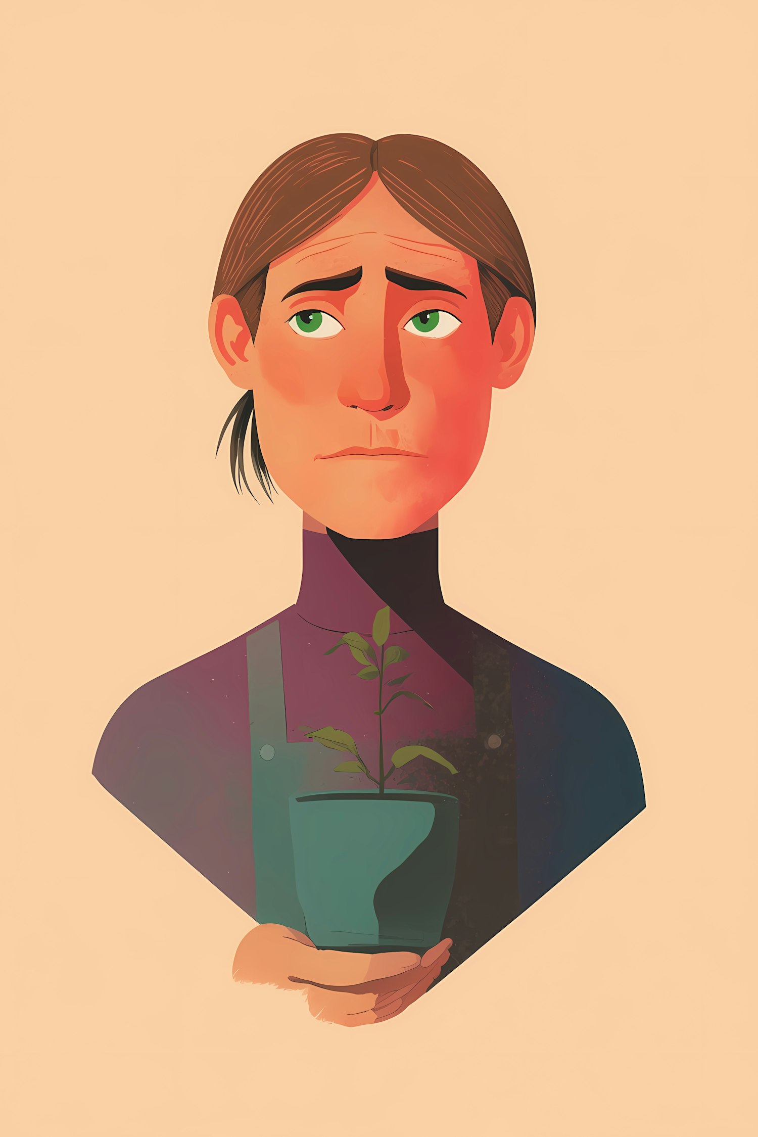 A stylized illustration of a person holding a small potted plant, with a contemplative expression and a warm, minimalistic background.