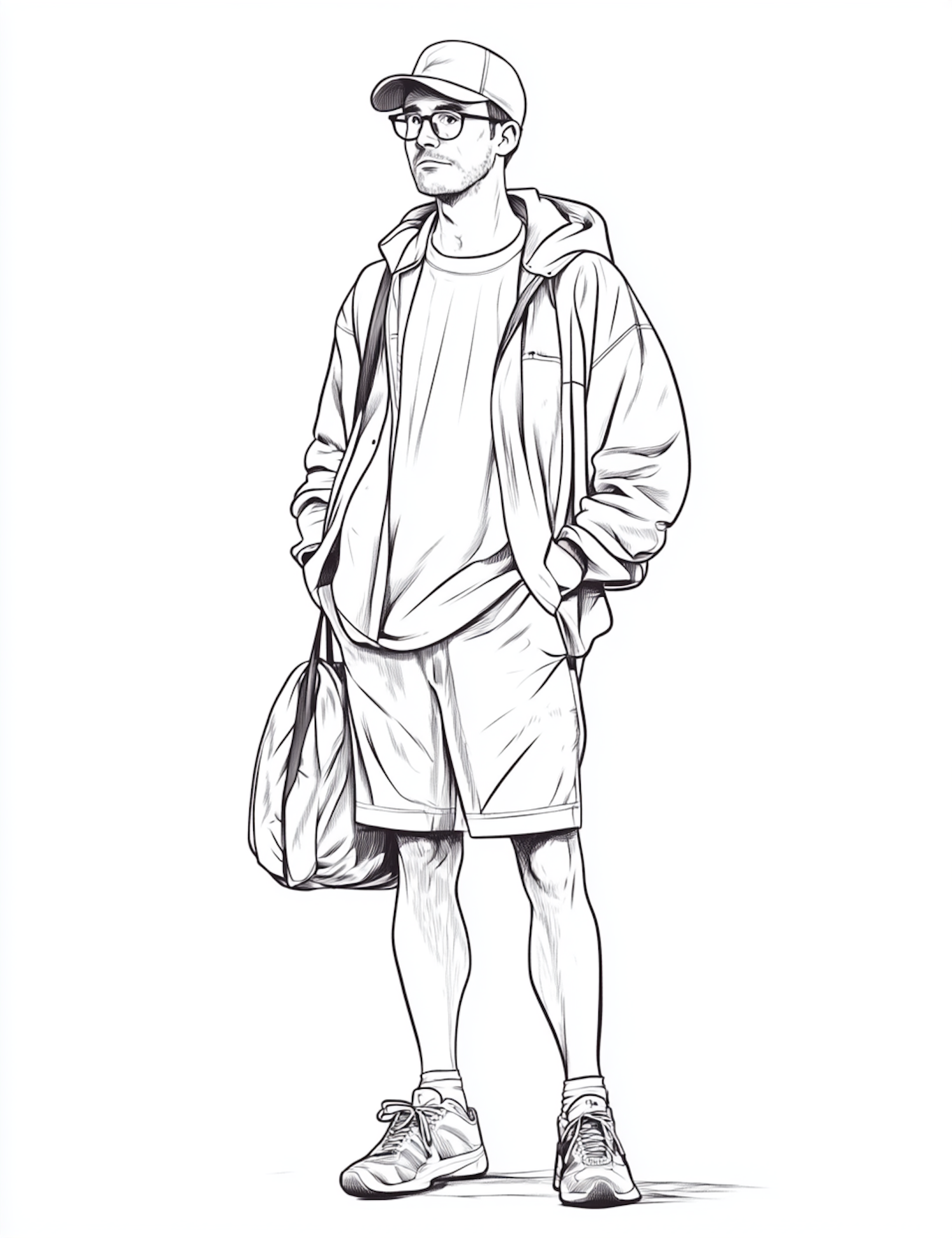 Black and white sketch of a casually dressed man with a cap, glasses, and a bag, exuding a relaxed vibe.