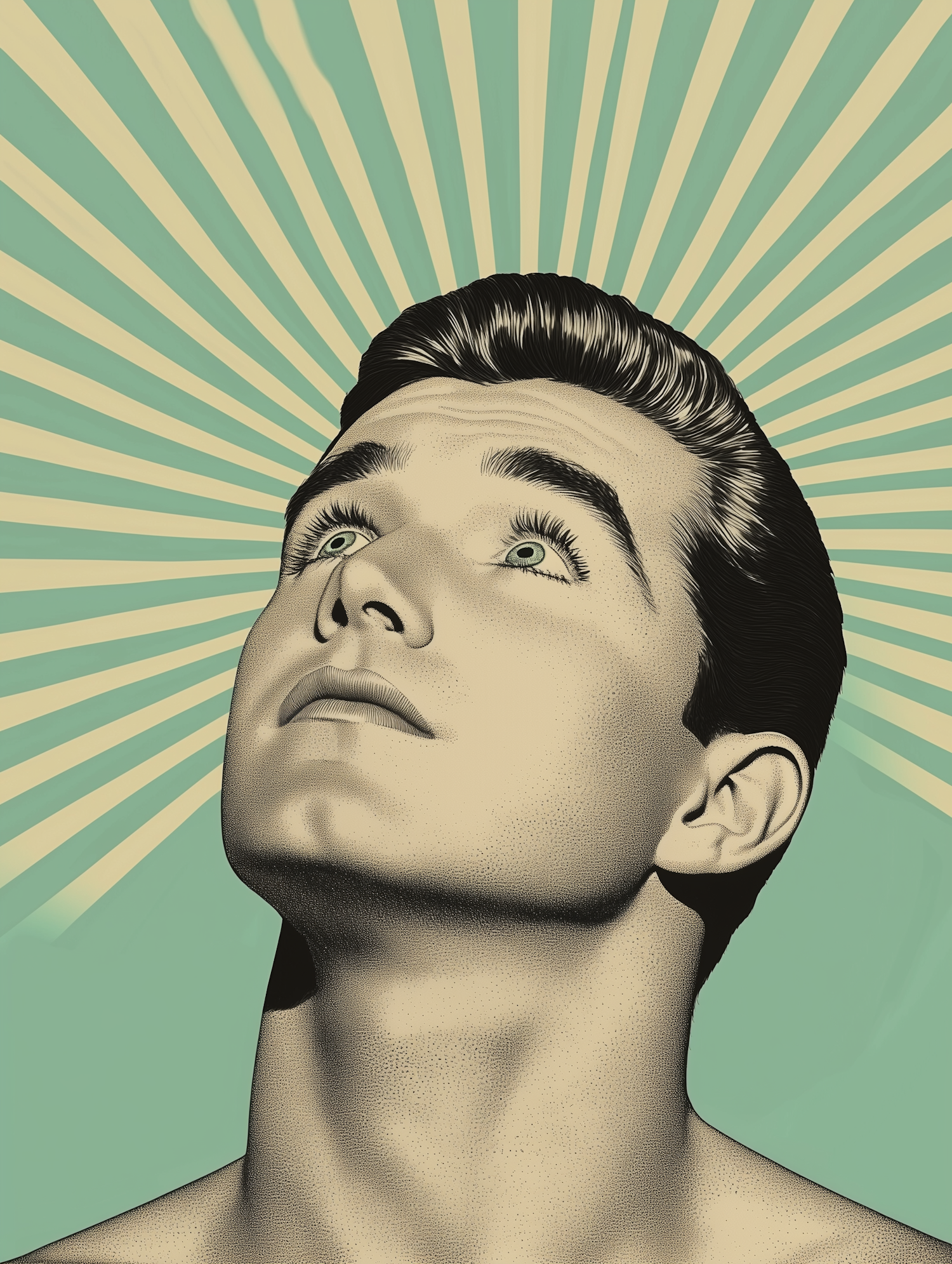 Retro pop art illustration of a young man looking upwards, with teal and cream radiating lines in the background.