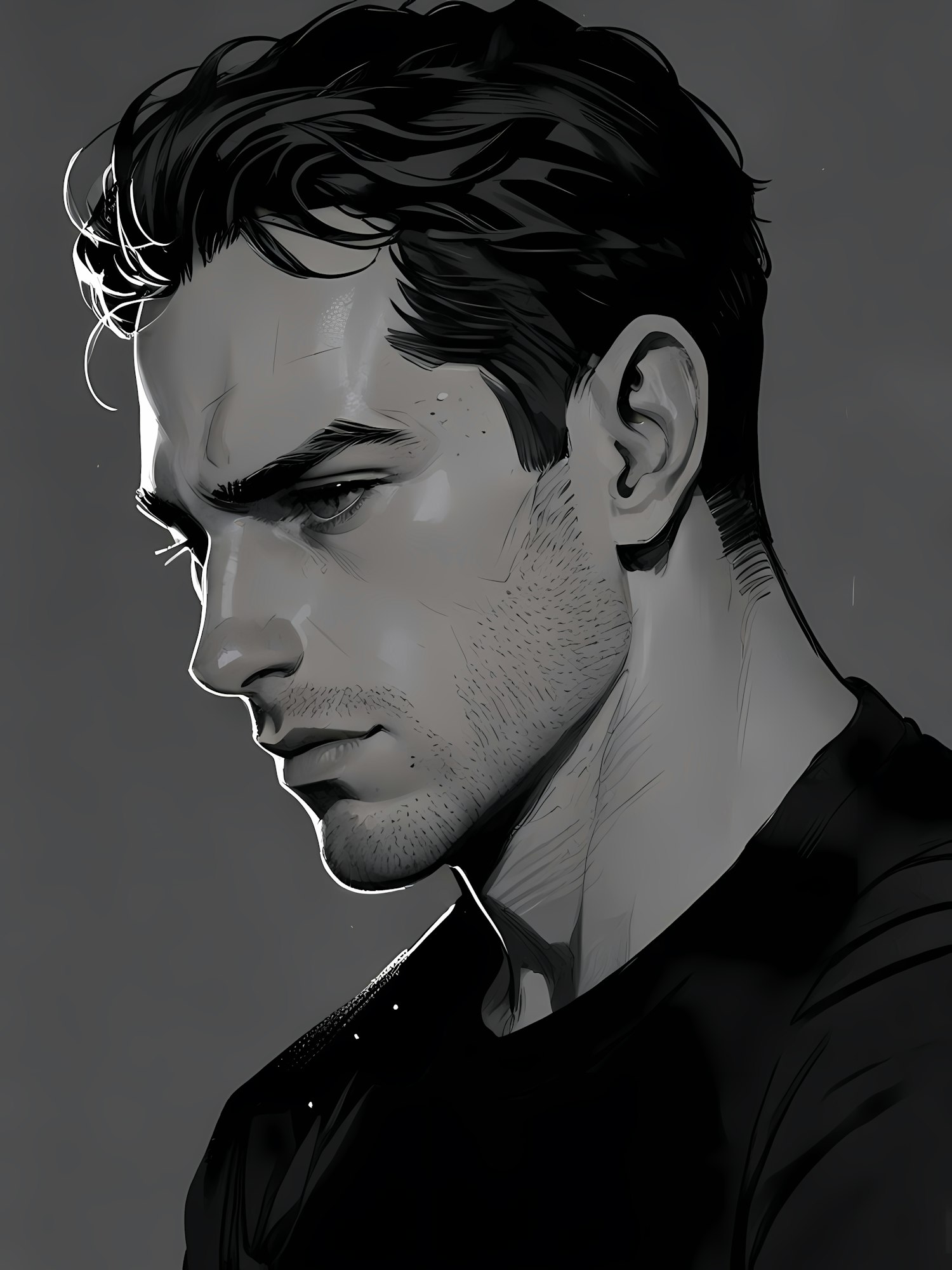 Black and white illustration of a contemplative man with dark hair and stubble, set against a gray background.