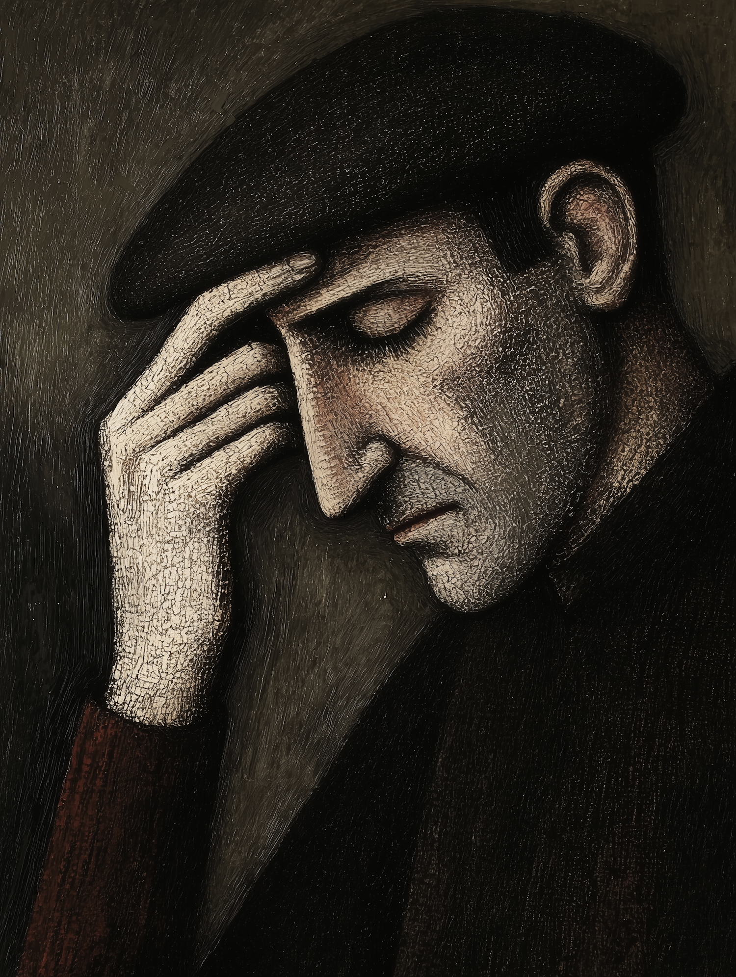 Illustration of a contemplative man in a beret, deep in thought, with a textured, somber background.