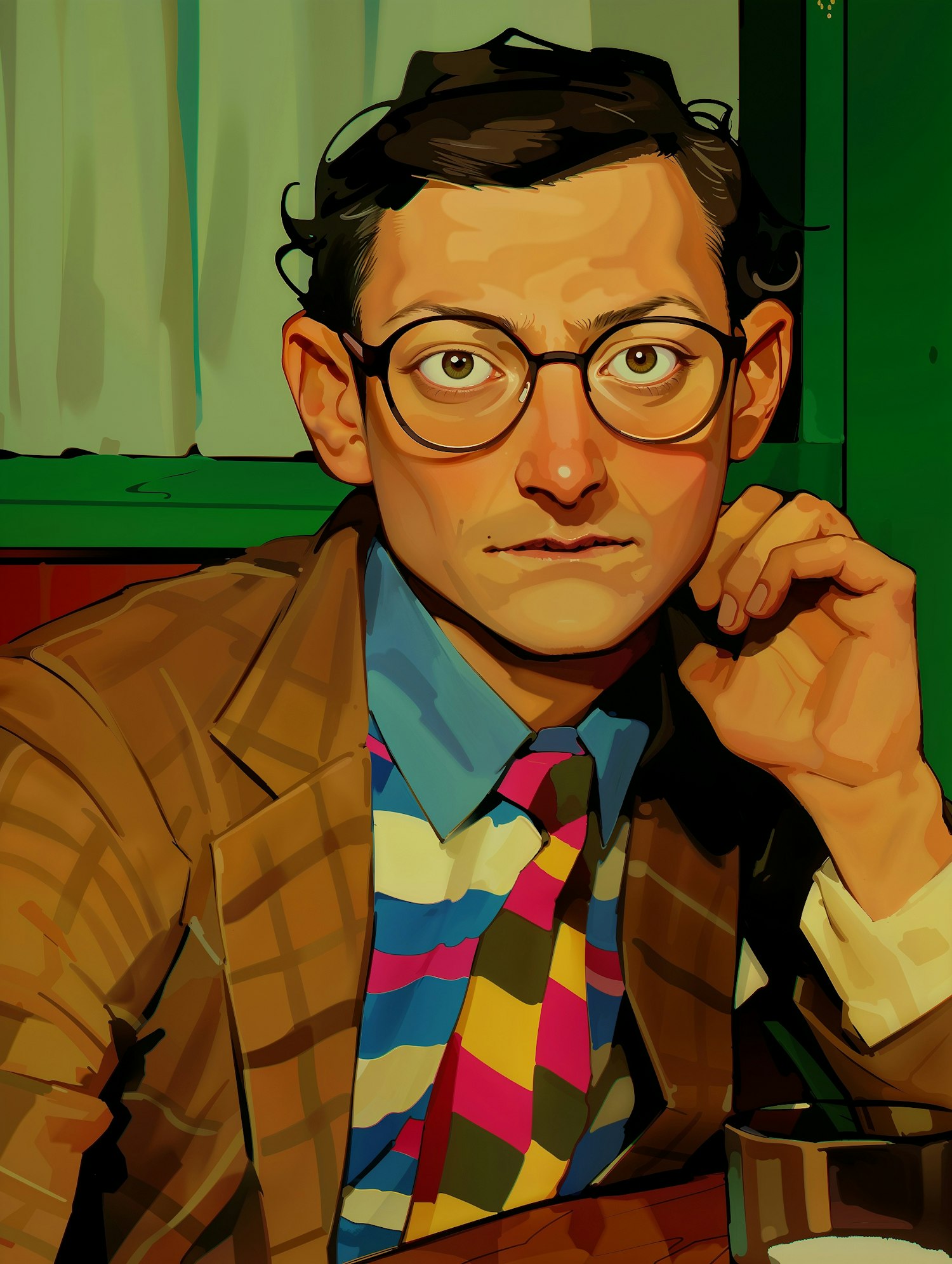 Illustration of a man in glasses with a colorful tie and plaid suit, exuding a retro vibe. His thoughtful expression adds intrigue.