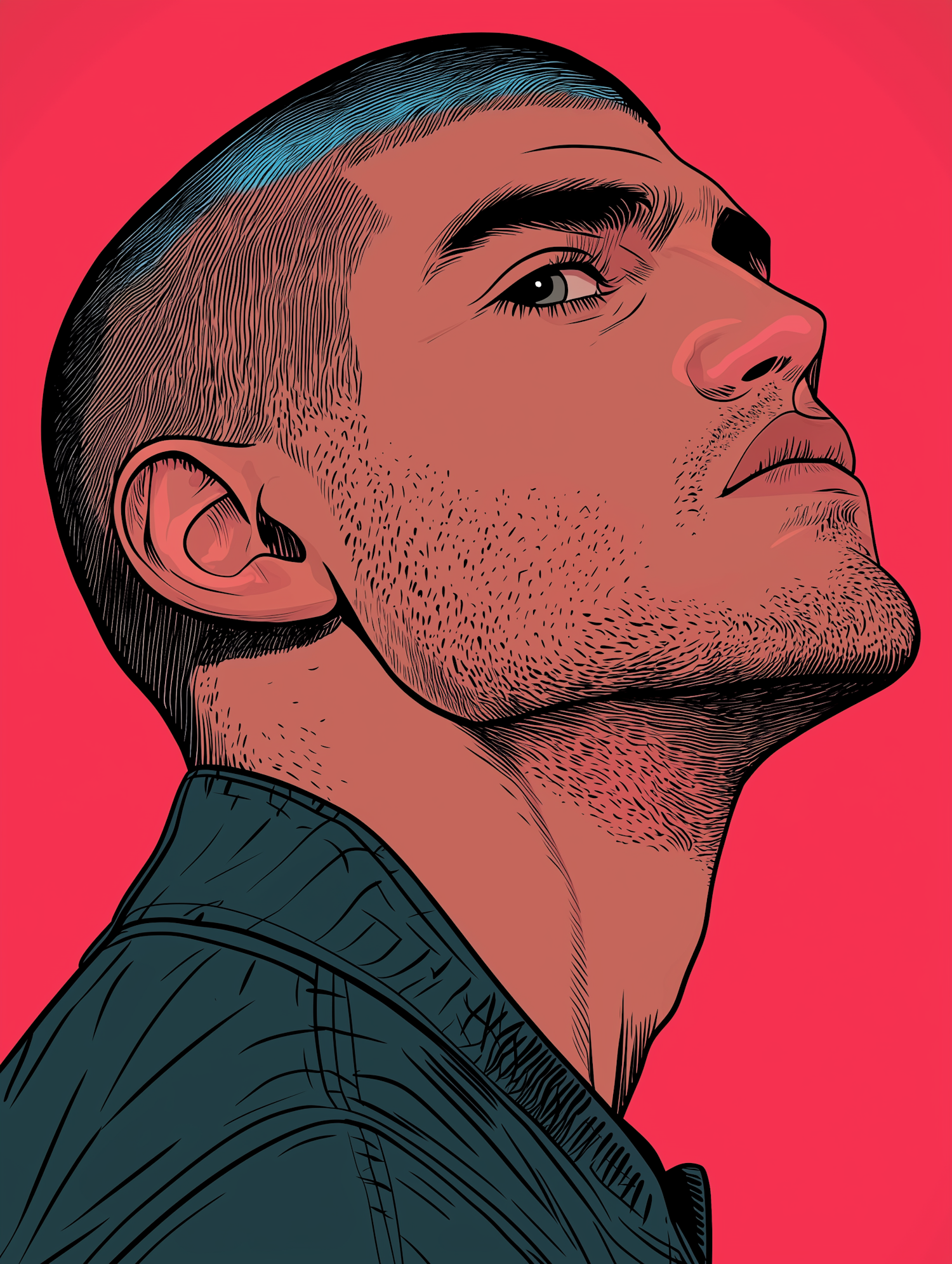 Stylized illustration of a man with short hair and stubble, looking upwards against a bold red background.