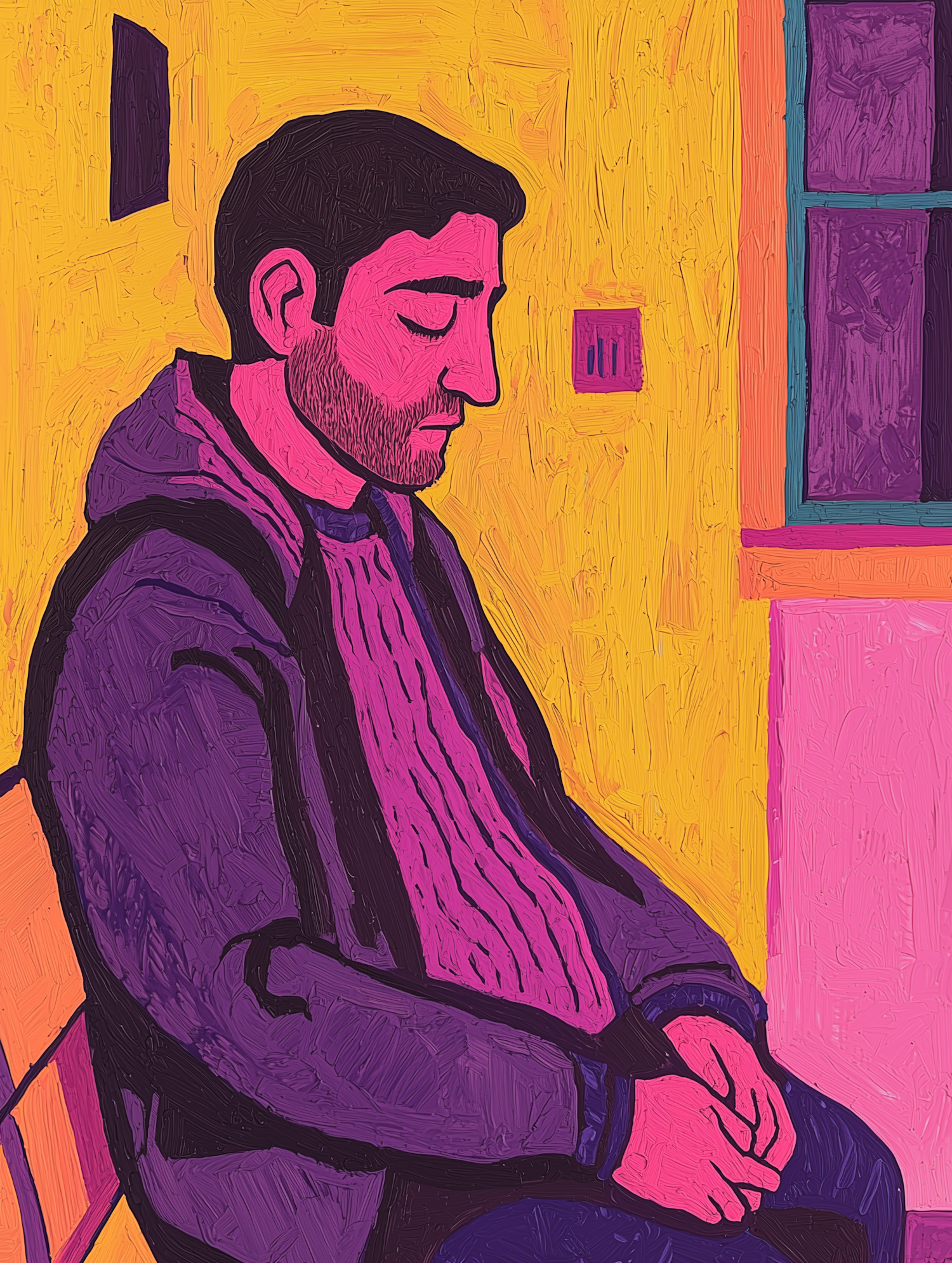 Vibrant illustration of a man in a purple jacket and pink sweater, sitting contemplatively against a bright yellow background.