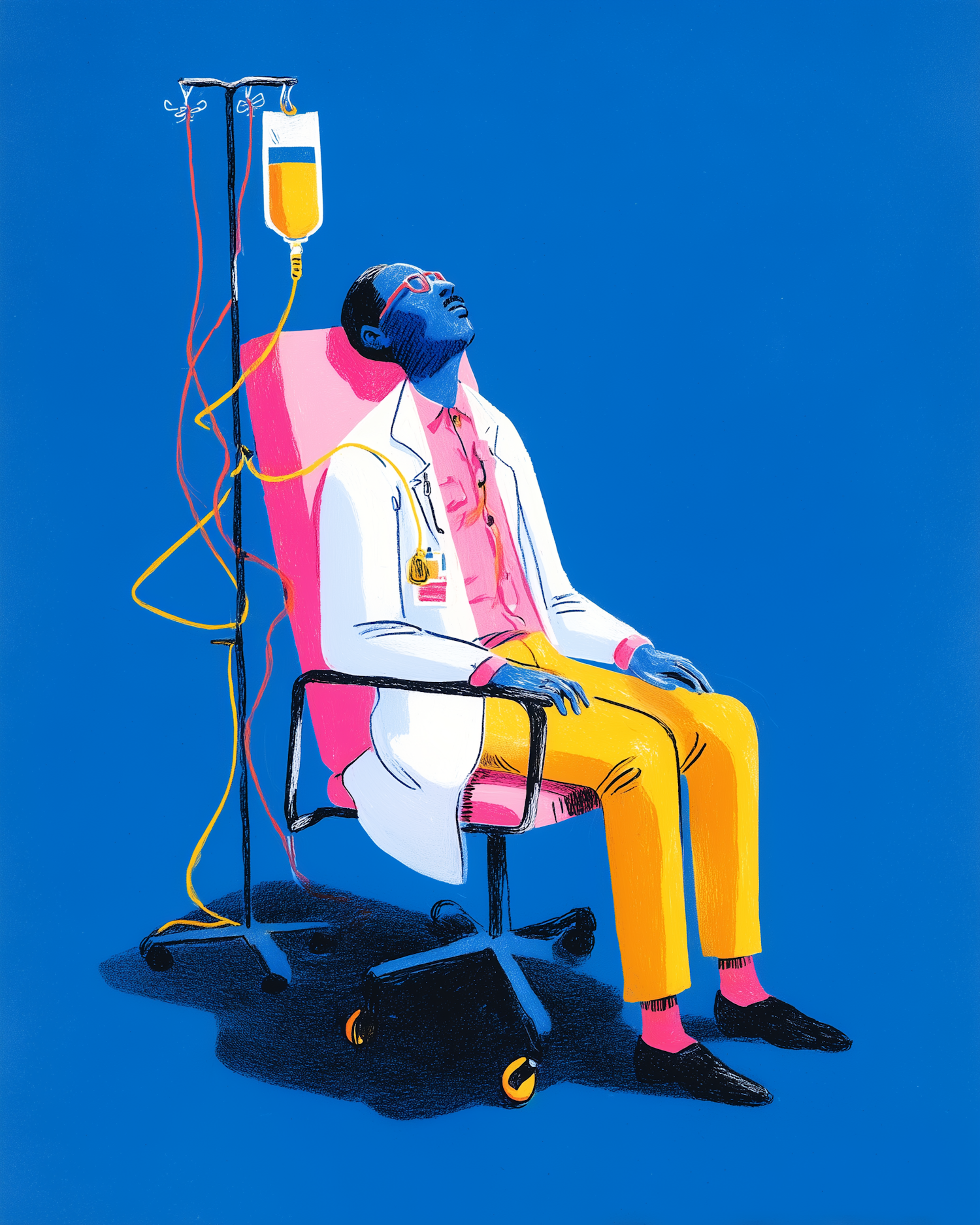Colorful illustration of a medical professional resting in a chair, connected to an IV drip, against a bold blue background.