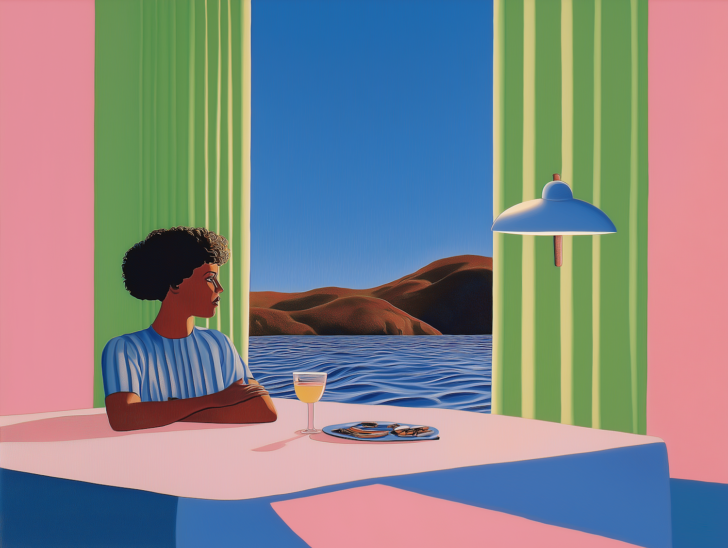 Person in striped shirt gazes out window at serene landscape, with wine and food on table. Vibrant colors and modern decor.