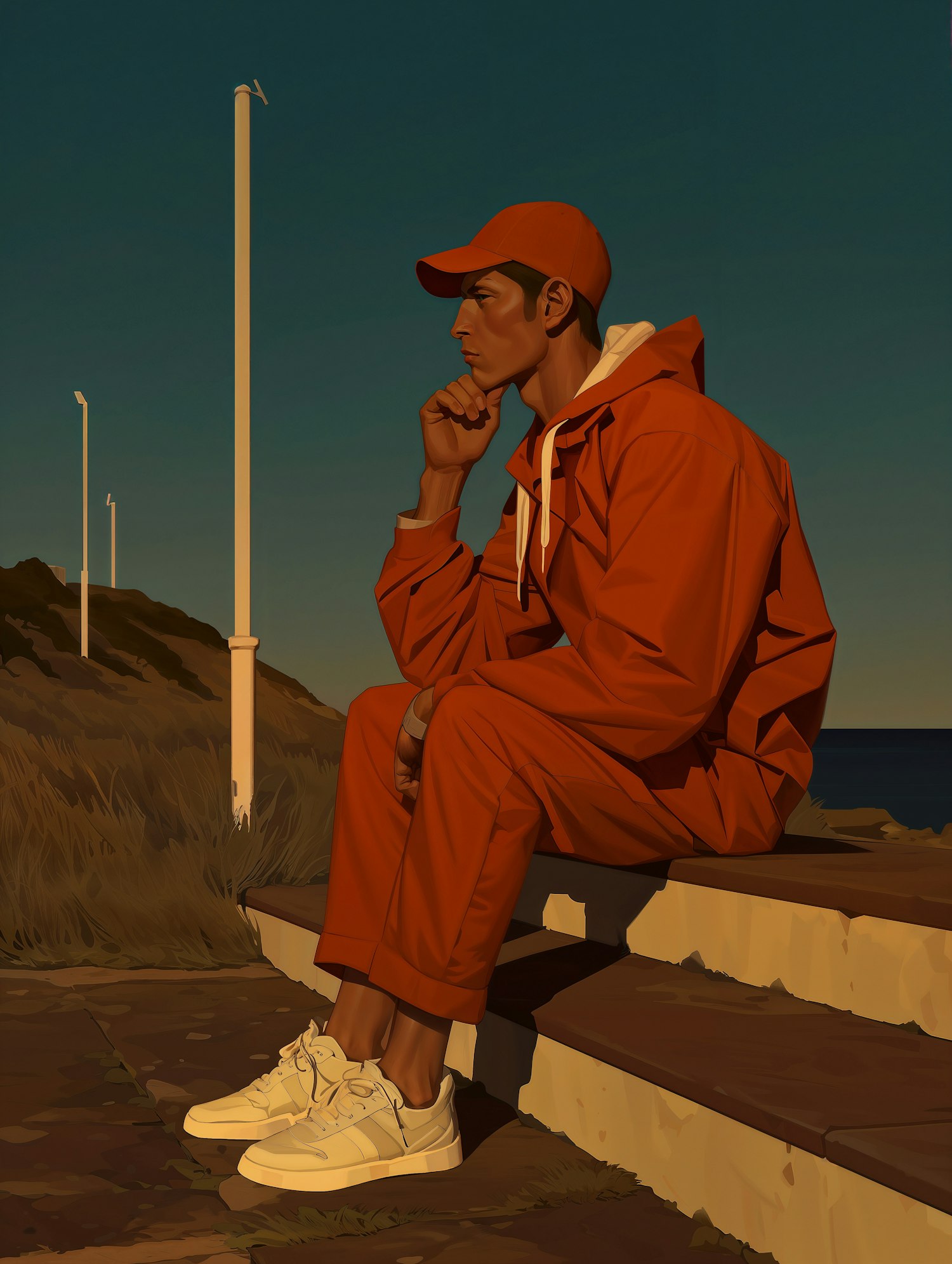 Man in orange tracksuit sits on steps, contemplating under a teal sky. Warm lighting and streetlights create a serene atmosphere.
