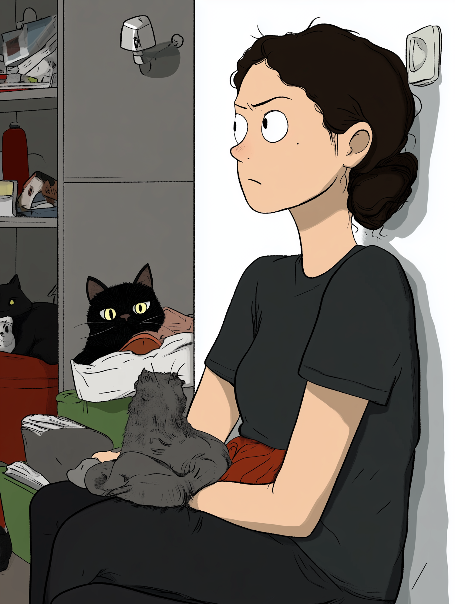 Cartoon woman with a gray cat in her lap, sitting in a cluttered room. A black cat with yellow eyes watches from a shelf.