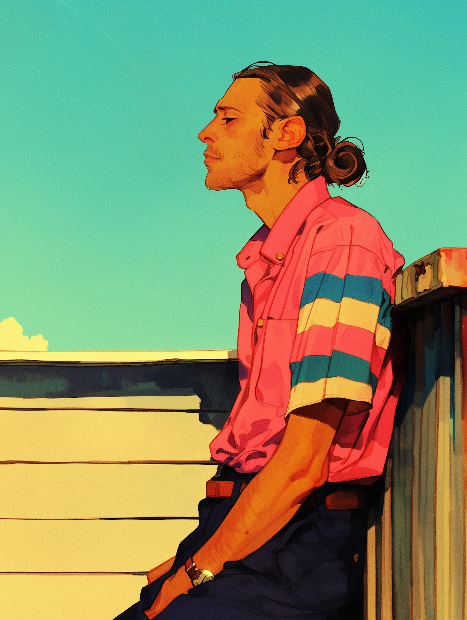 Stylish young man in a pink shirt with stripes, gazing thoughtfully against a clear blue sky. Vibrant and contemplative illustration.