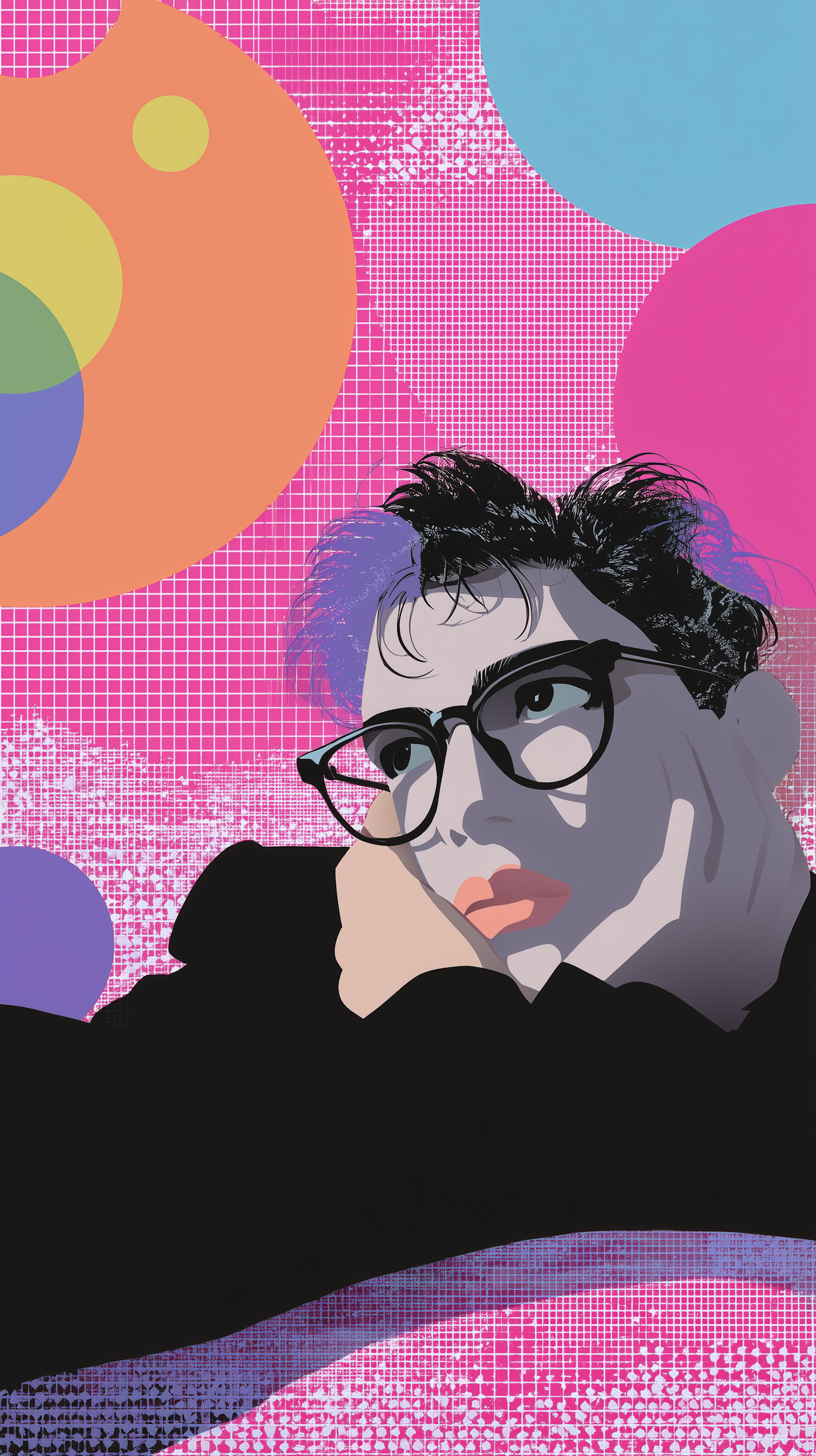 A colorful pop-art style illustration of a person with glasses, set against a vibrant geometric background.