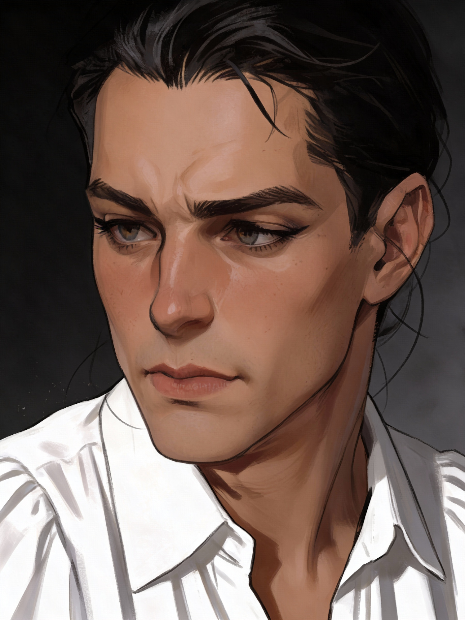 A detailed digital portrait of a person with dark hair and a white shirt, showcasing a thoughtful expression against a dark background.