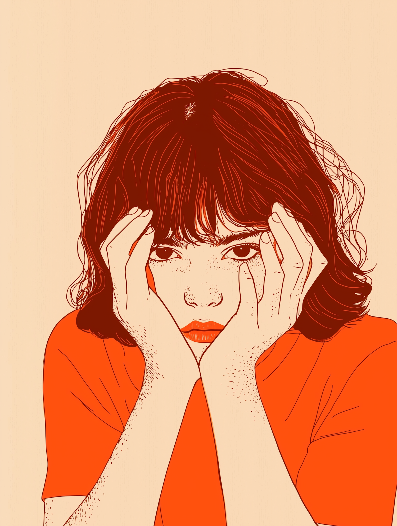 Stylized illustration of a person with dark hair in an orange shirt, hands on cheeks, against a beige background. Thoughtful expression.