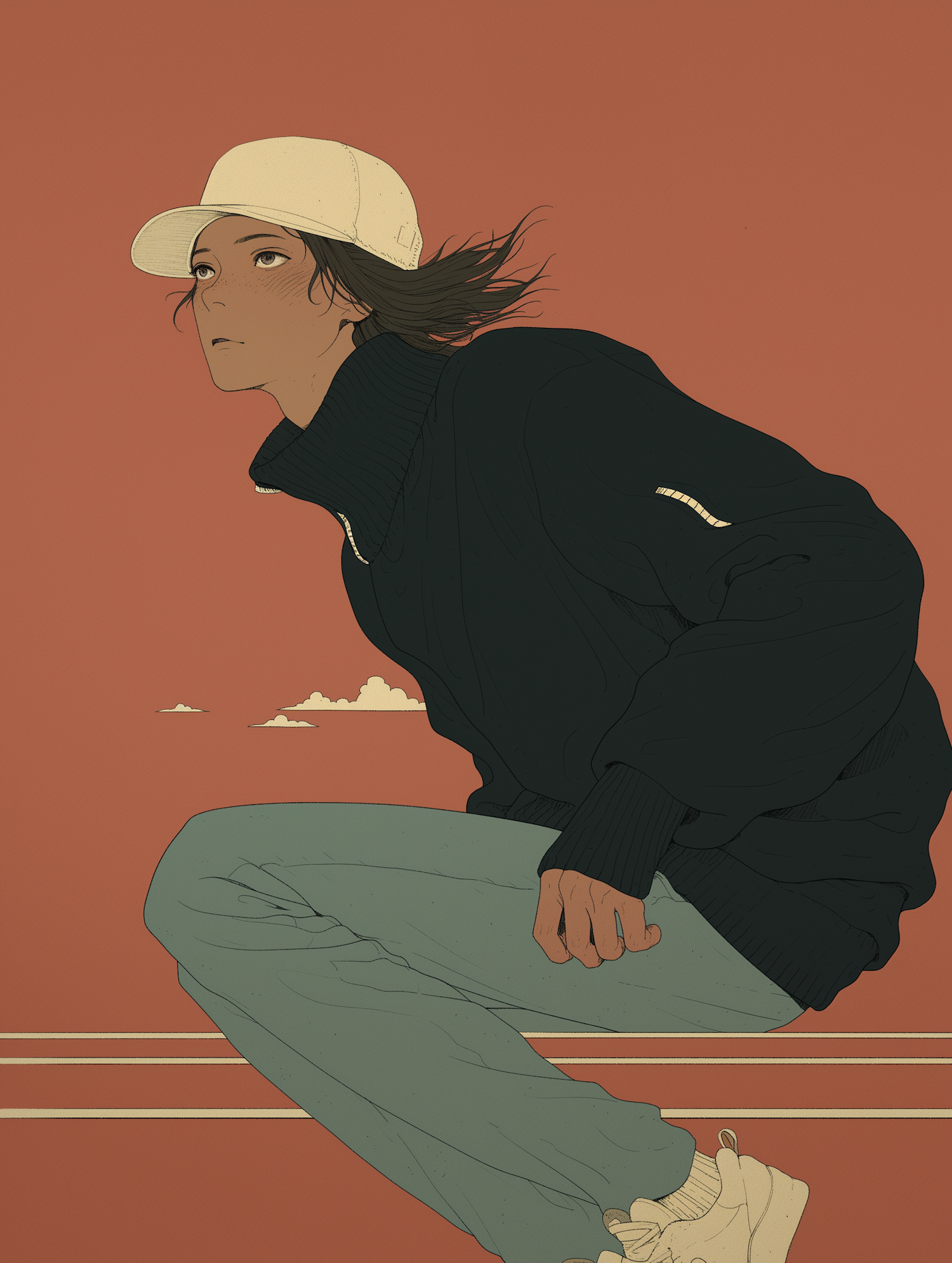 Illustration of a person in a cap and sweater, gazing upward against a warm orange background, conveying motion and introspection.