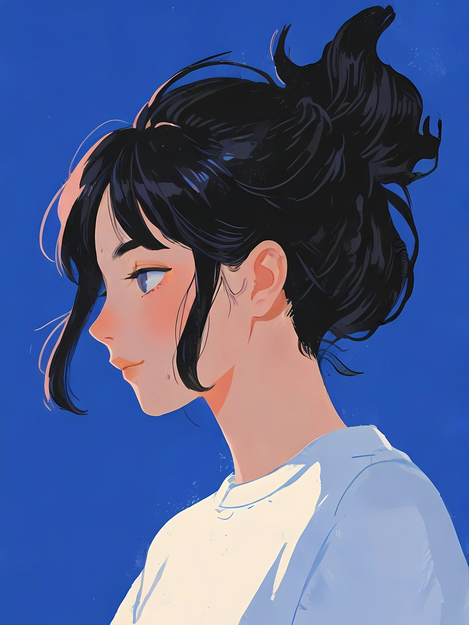 Digital illustration of a young woman with dark hair in a bun, blue eyes, and a white shirt against a vibrant blue background.