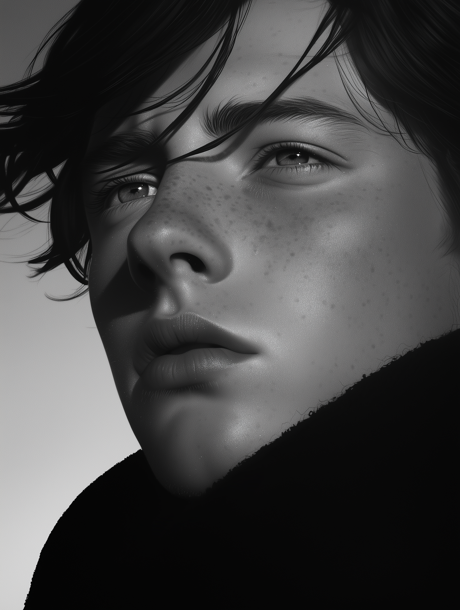 Black and white close-up portrait of a young male with freckles, expressive eyes, and tousled hair, creating a dramatic and artistic effect.