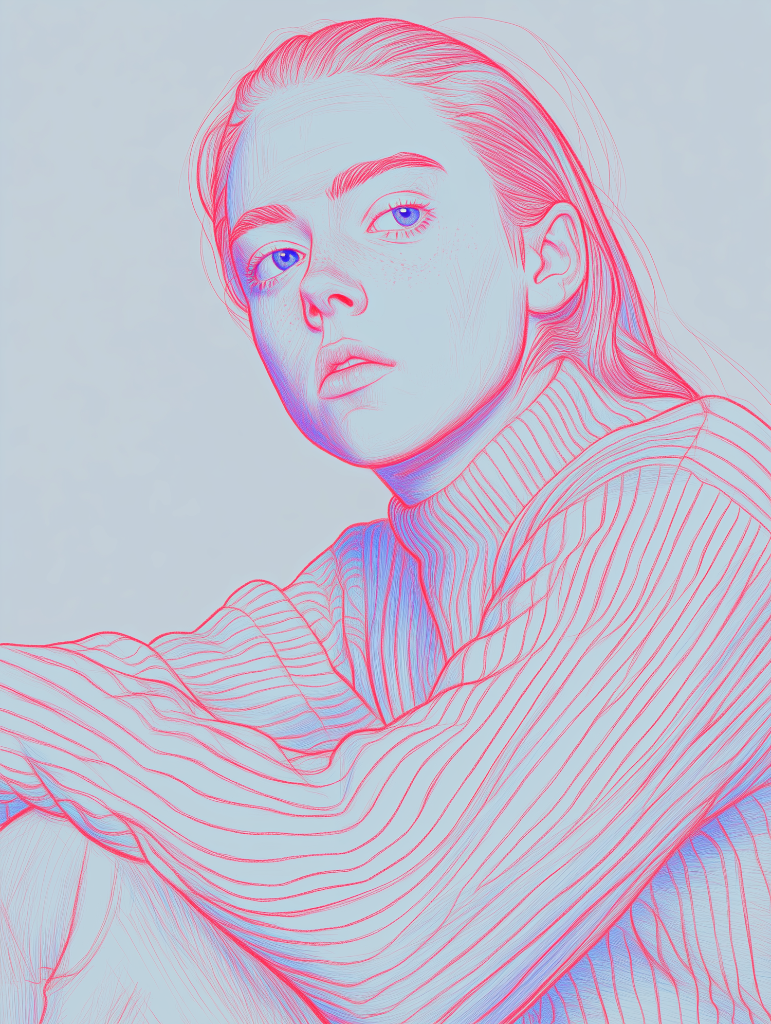 Vibrant digital illustration of a young person with blue eyes, using pink and blue lines for a modern aesthetic.