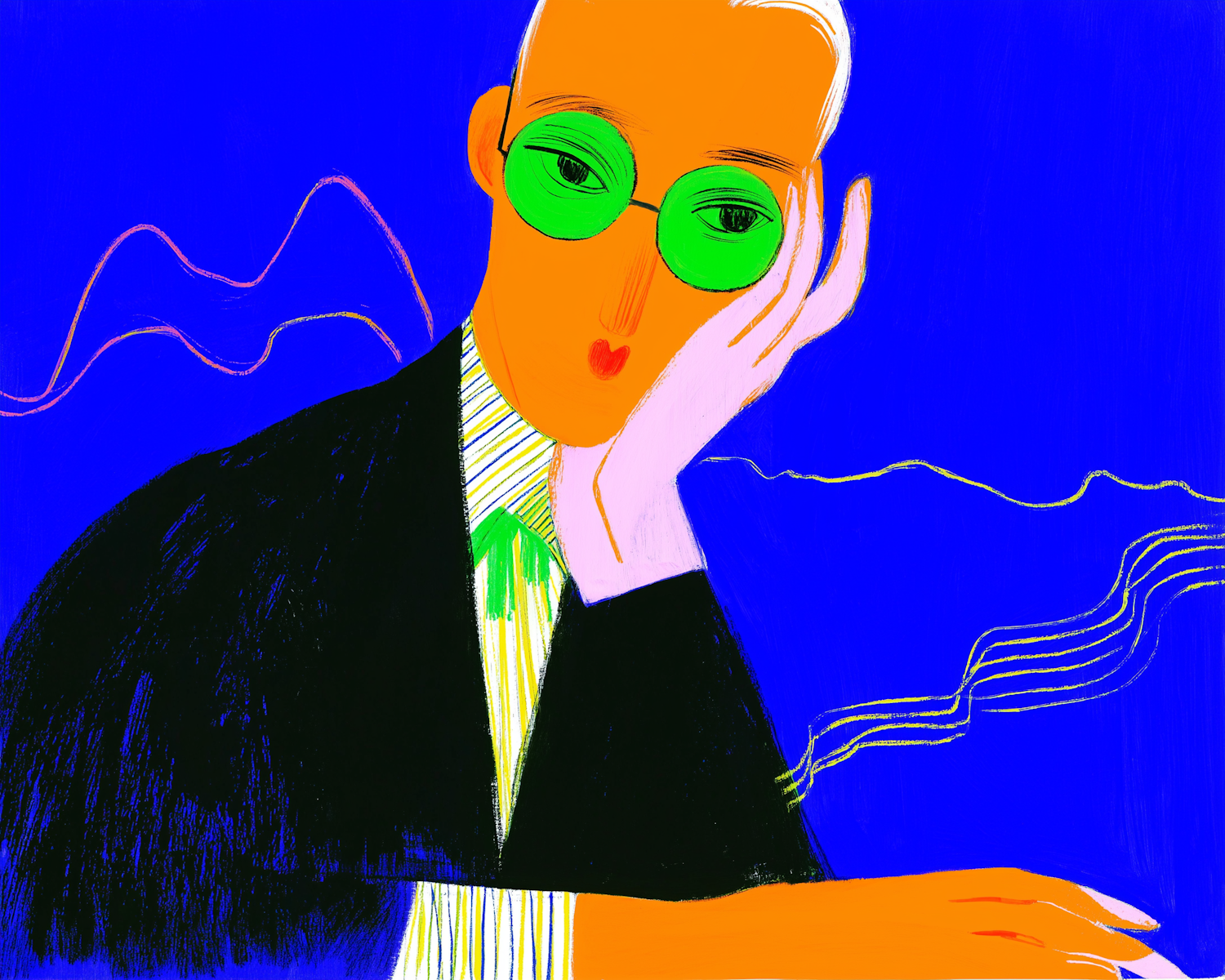Stylized illustration of a person with green glasses and a black suit against a bold blue background with abstract lines.