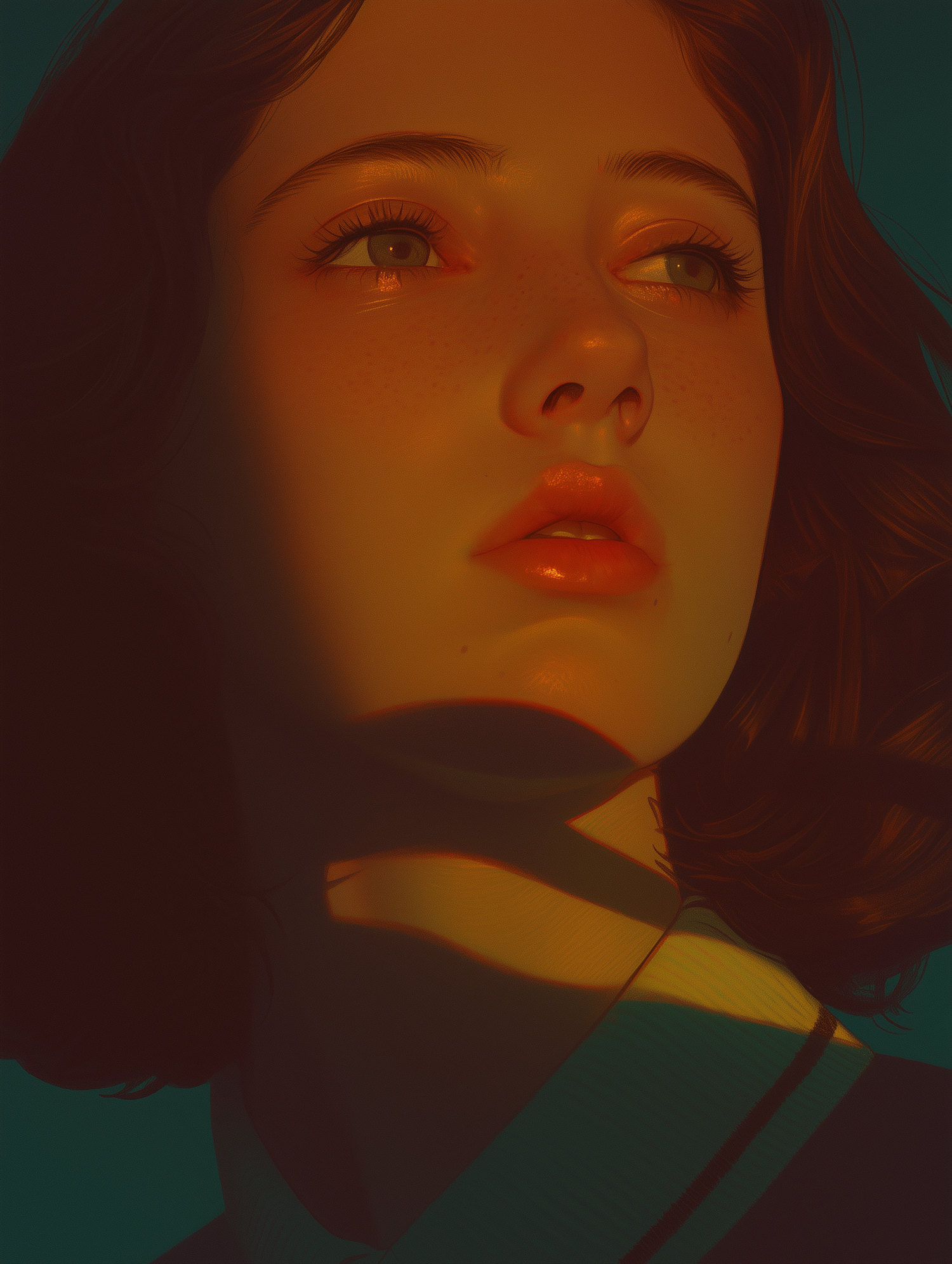 A serene portrait of a young woman with light brown hair and green eyes, highlighted by dramatic shadows and a deep teal background.