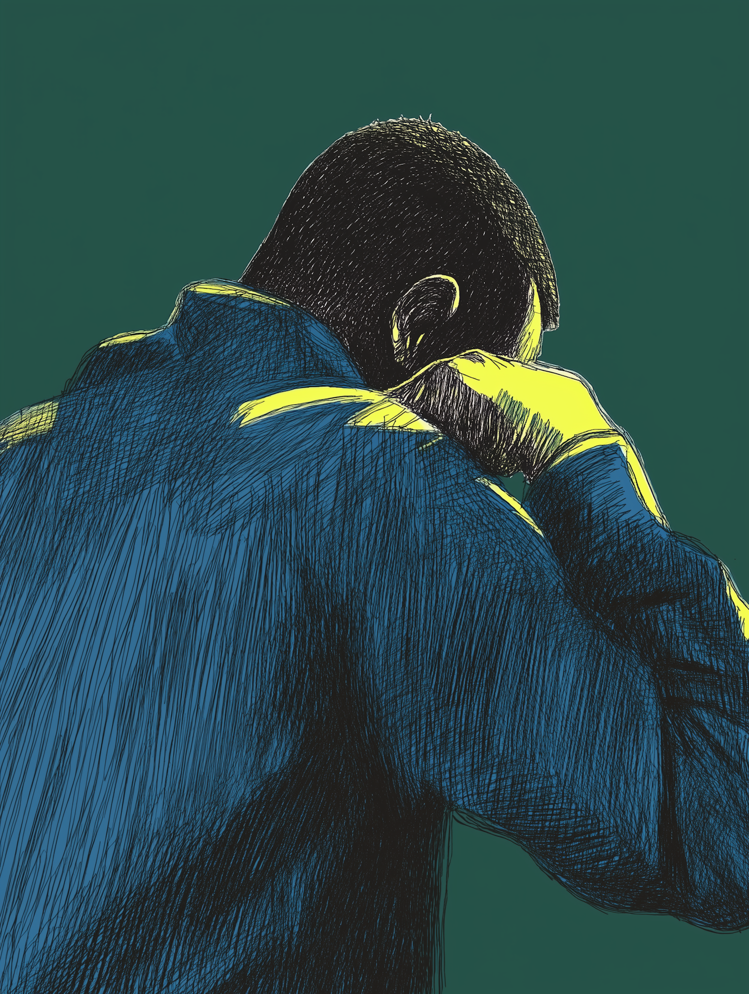 Stylized illustration of a person in a blue jacket with head resting on hand, set against a dark green background.