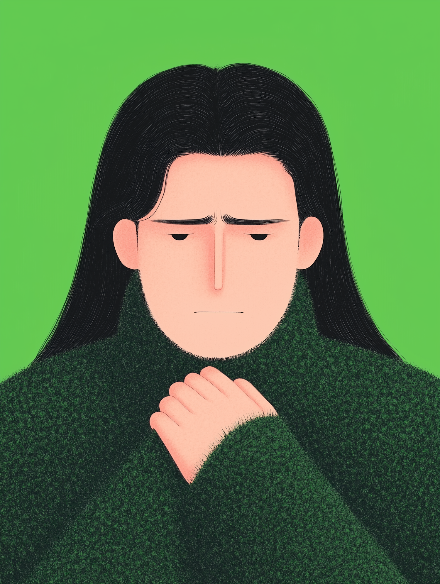 Stylized illustration of a somber person with long black hair, green sweater, and vibrant green background, evoking a contemplative mood.