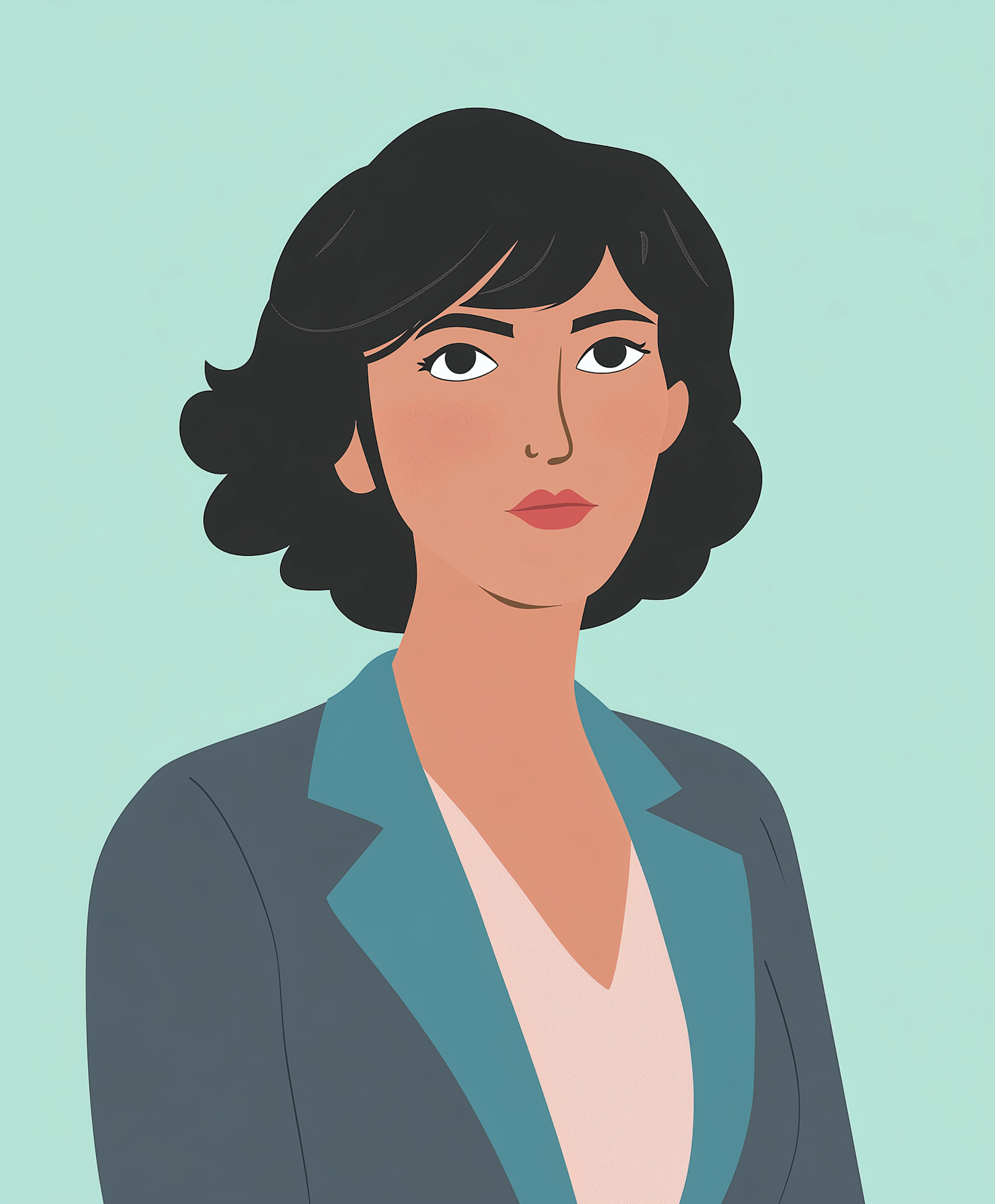 Stylized illustration of a woman with short black hair in a teal blazer, set against a mint green background.