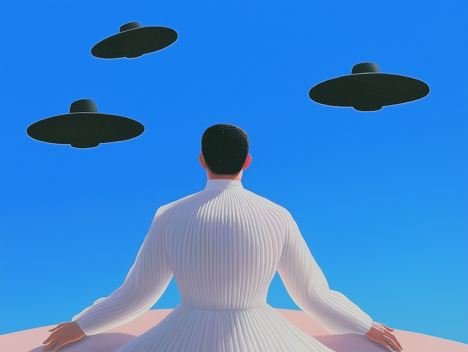 Person in white pleated outfit gazes at three UFO-like objects in a clear blue sky, creating a surreal and contemplative scene.