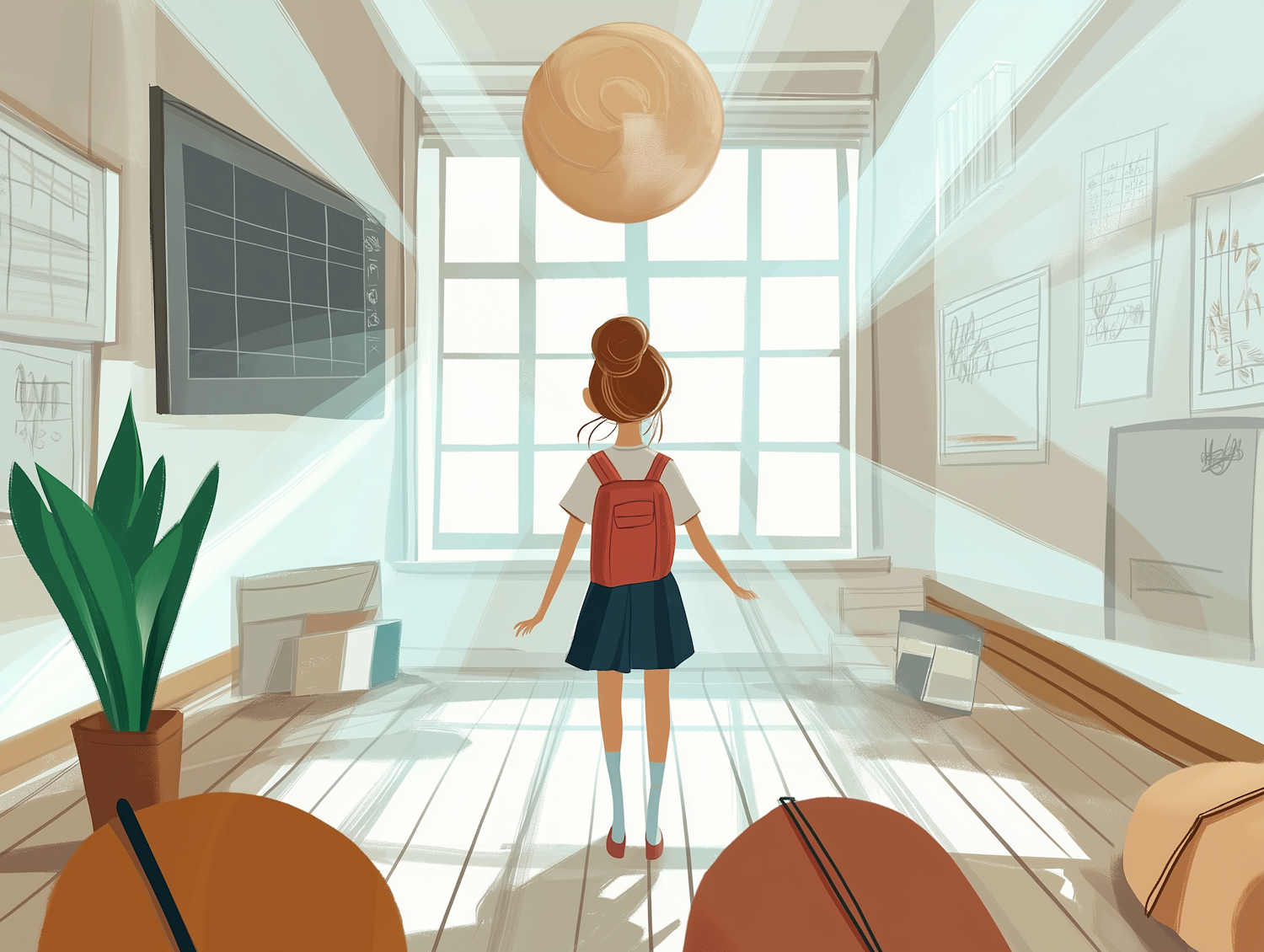 A young girl in a sunlit classroom, wearing a red backpack, stands facing a large window. Warm light and shadows create a serene atmosphere.