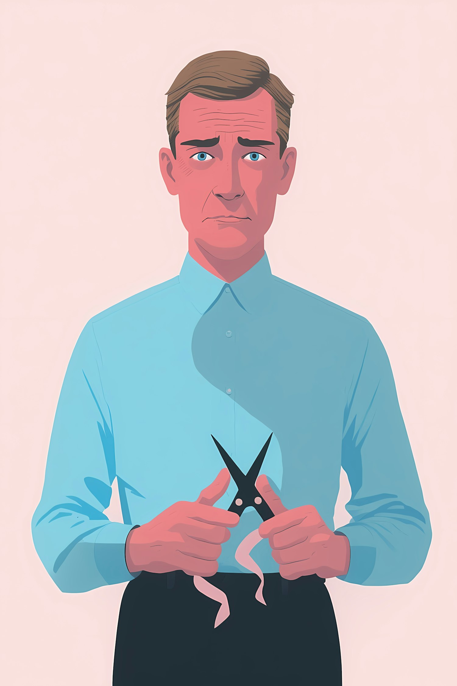 Stylized illustration of a man holding scissors with a contemplative expression, set against a pastel pink background.