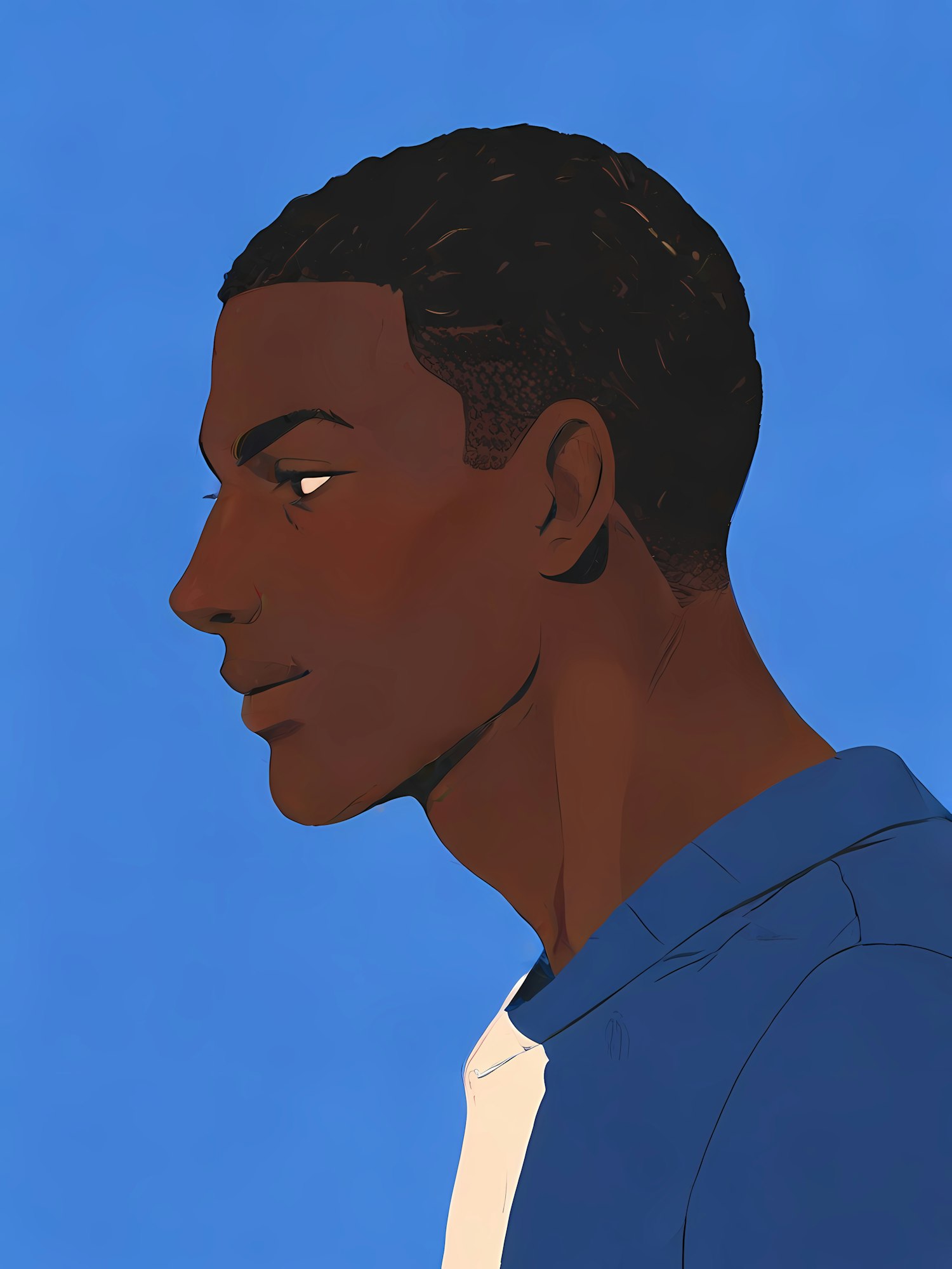 Digital illustration of a young Black man in profile with short hair, wearing a blue shirt, set against a solid blue background.