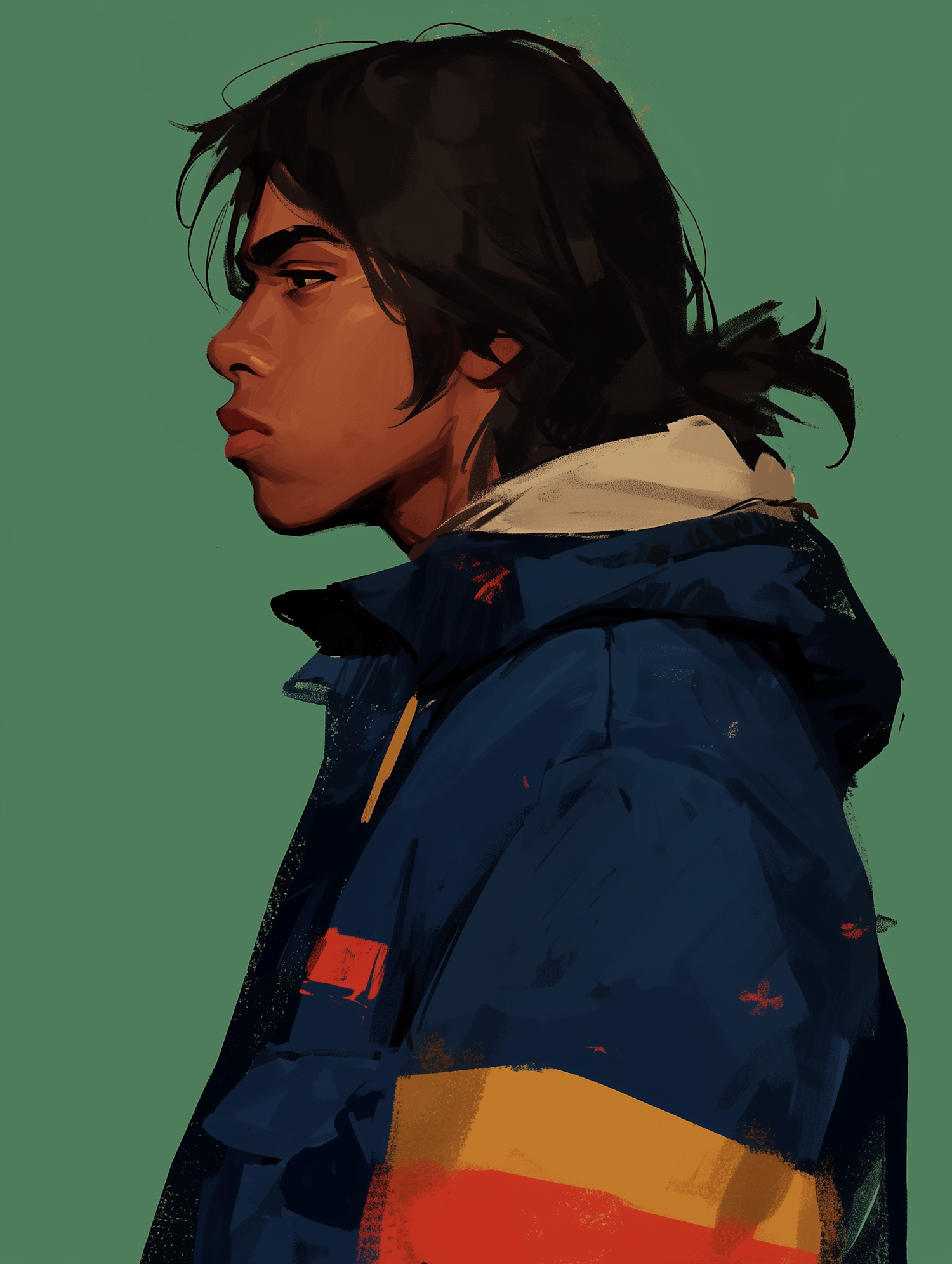 Profile illustration of a young person with long dark hair in a blue jacket against a green background.