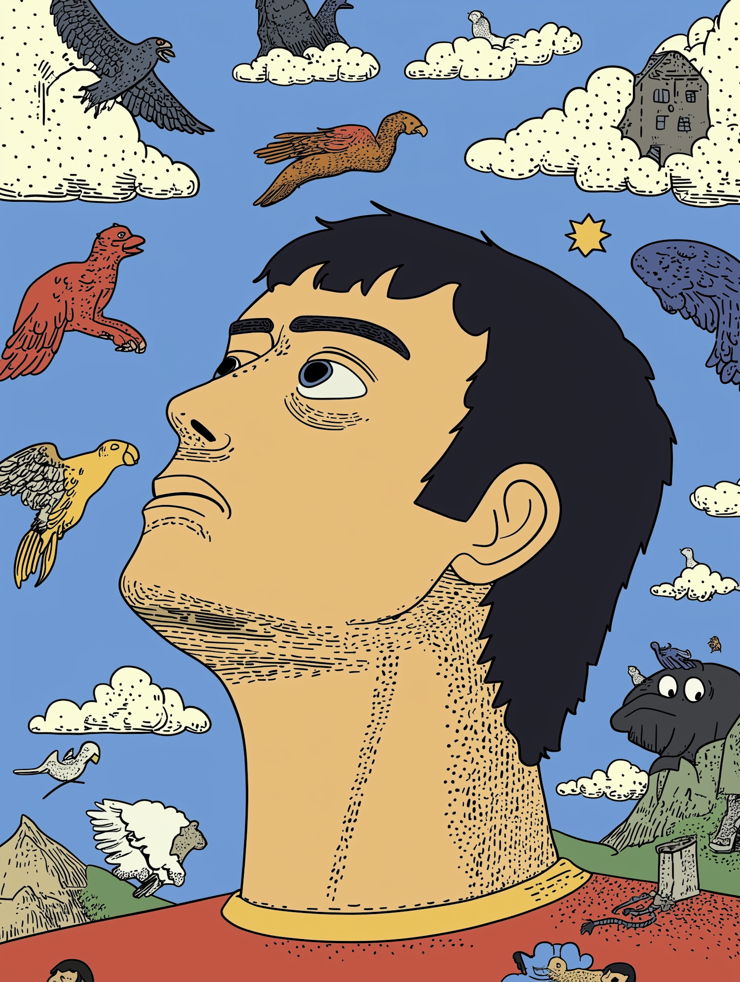 Stylized illustration of a man gazing at colorful birds in a whimsical sky filled with clouds and imaginative elements.