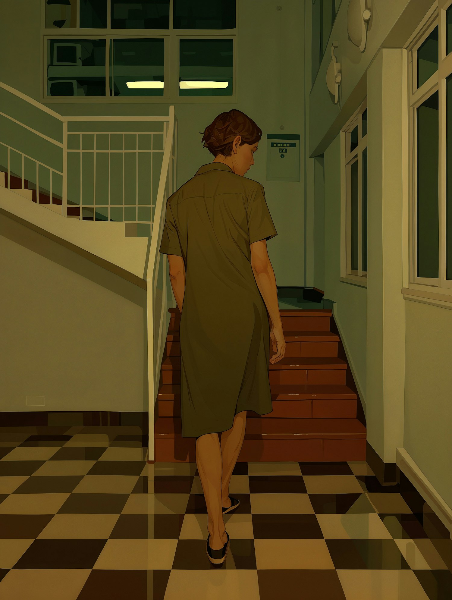 A woman in an olive-green dress walks up stairs in a dimly lit interior with checkered floors and muted tones, evoking a quiet mood.
