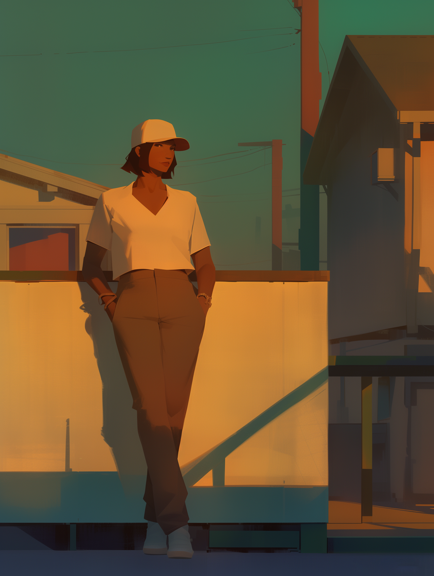 A woman in a white cap and top leans against a wall in warm sunlight, set against a minimalist urban backdrop.