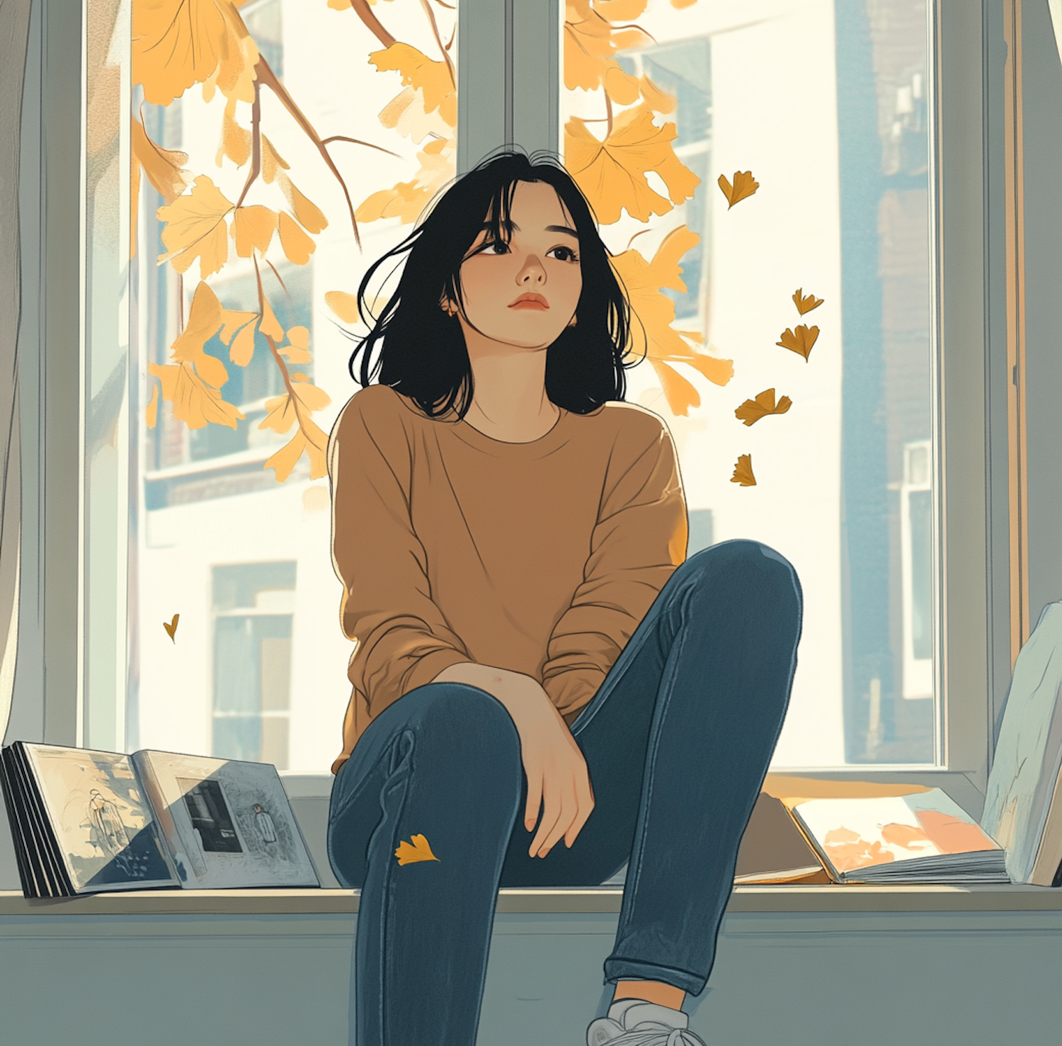 A young woman sits by a window with autumn leaves, wearing a brown sweater and jeans, surrounded by open books. Serene and introspective.