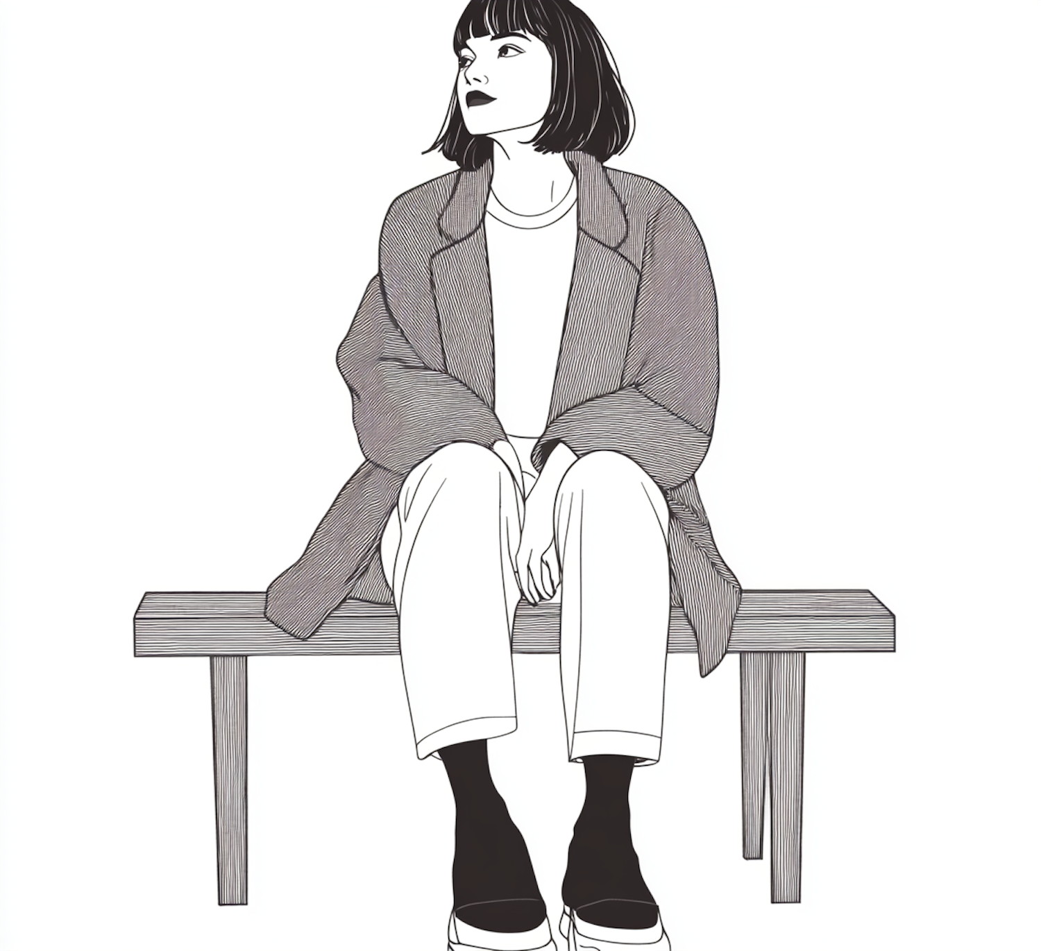 Minimalistic black and white illustration of a woman sitting on a bench, wearing a coat and pants, with a contemplative expression.