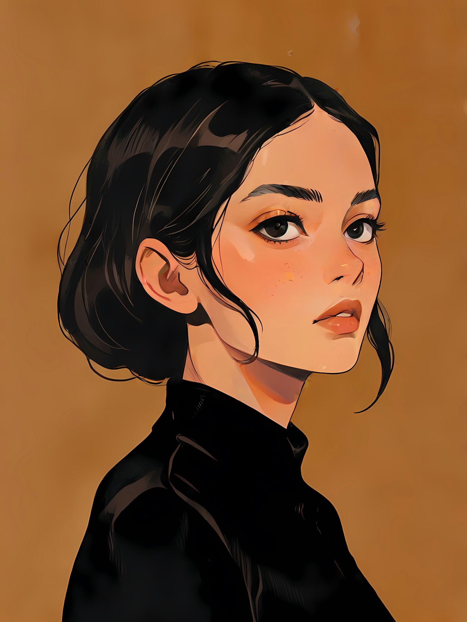 Elegant digital illustration of a woman with dark bobbed hair and expressive eyes against a warm brown background.