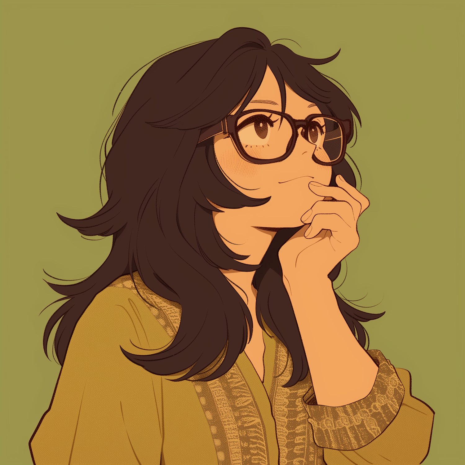 Stylized illustration of a thoughtful woman with glasses, black hair, and a mustard-yellow patterned top on an olive green background.