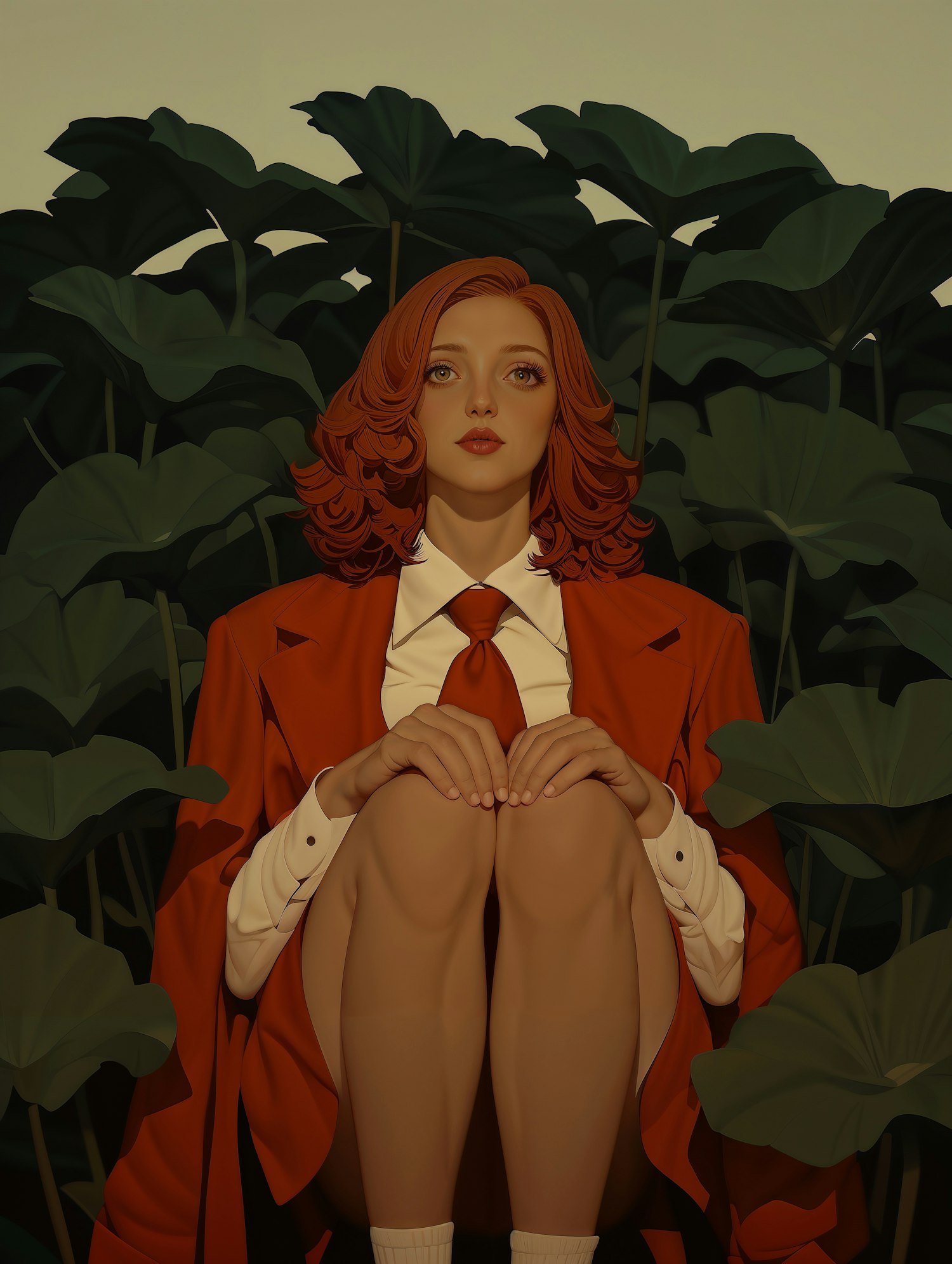 A red-haired woman in a red blazer sits among lush green leaves, creating a striking contrast. Her expression is calm and contemplative.